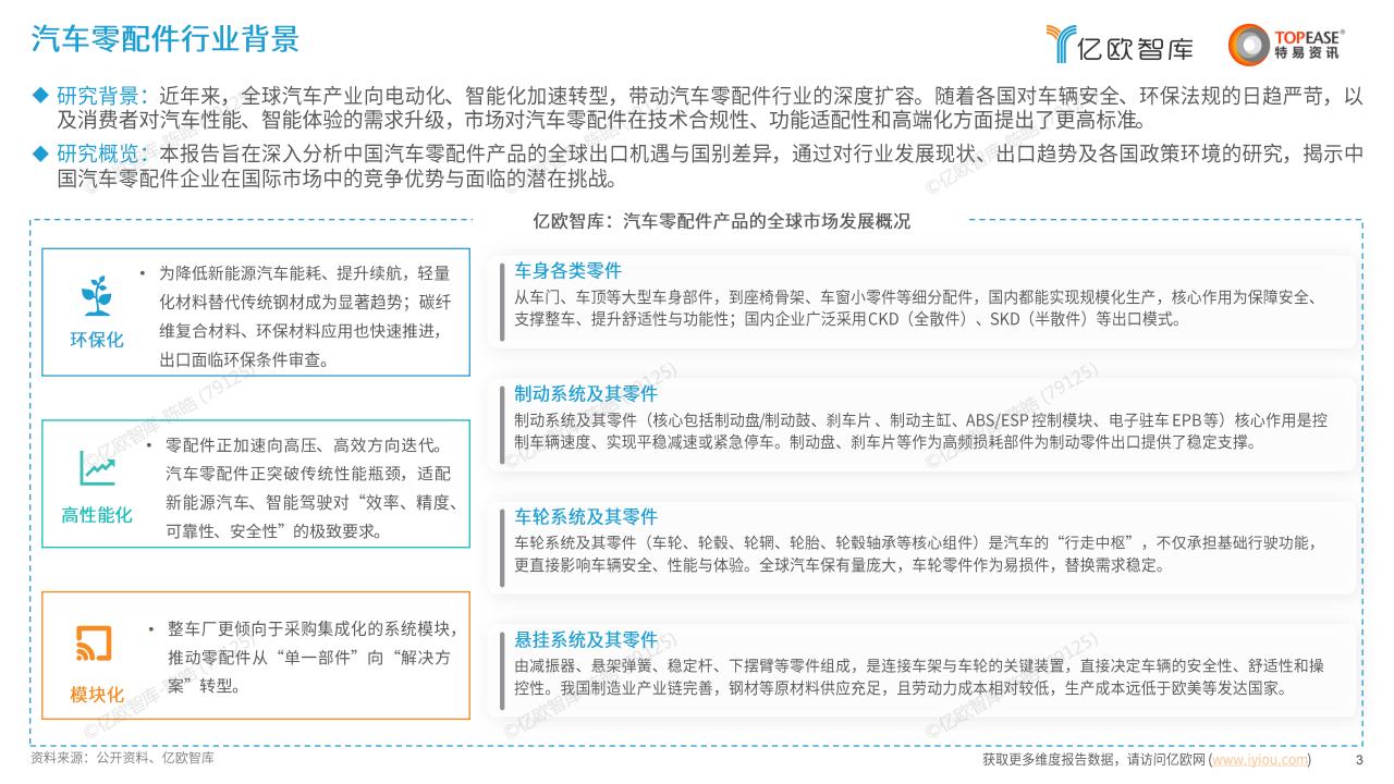 研究概要:本报告旨在深入分析中国汽车零部件产品的全球出口机遇与国别差异,通过对行业发展现状、出口趋势及各国政策环境的研究,揭示中国汽车零部件企业在国际市场中的竞争优势与面临的潜在挑战。