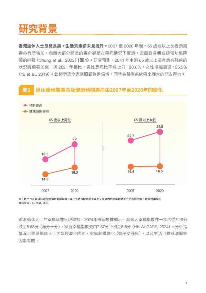 香港退休人士愈見長壽,生活質素卻未見提升。2007至2020年間,65歲或以上長者預期毒命有所增加,然而大部分延長的壽命卻是在帶病情況下度過,需面對身體或認知功能障碰的挑戰(Chungetal.,2023)(圖1)。研究預測,2041年本港65歲以上長者患有殘疾的當況將顯著加劇:與2021年相比,男性患病比率將上升128.6%,女性增幅更達135.5%(Yuetal.,2019)。此趨勢恐令家庭照顧負擔倍增,同時為醫療系統帶來龐大的開支壓力。香港退休人士的幸福感亦呈现跌勢。2024年最新數據顯示,其個人幸福指數在一年內從7.29分跌至6.63分(滿分十分),家庭幸福指數更由7.37分下滑至6.5分(HKWeCARE,2024)。分析指情况可能與退休人士面臨經濟不明朗、家庭結構變化(如子女移民),以及生活目標感減弱等因素有關。