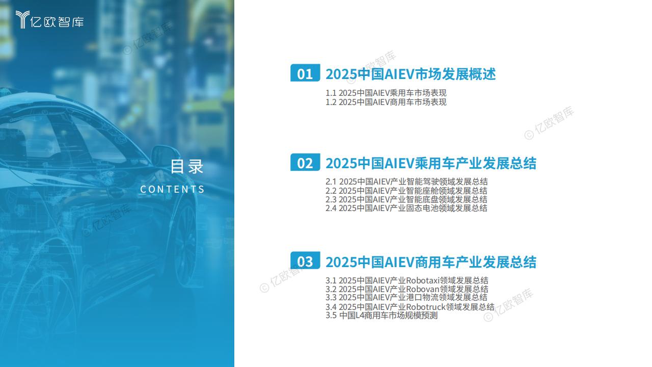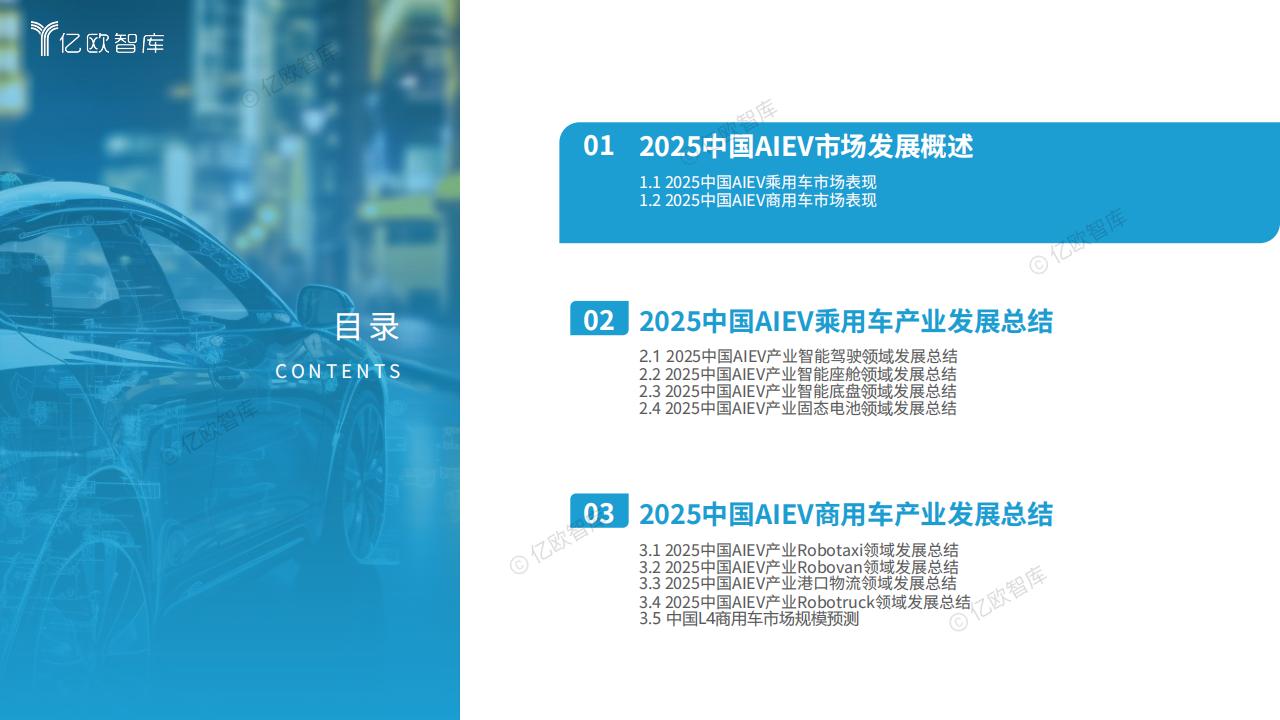 驱动的智能体空间,智能底盘在线控与线控转向、线控制动、主动悬架等方向加速量产。商用车侧,Robotaxi、Robovan、Robotruck及港口等L4场景实现限定区域内的常态化运营,为规模化复制与网络化调度奠定基础。面向2026年,随着算力平台、数据基础设施及固态电池等底层能力持续完善,AEV将在更多细分场景中实现更高程度的人-车-路-云协同,推动产业从“单车智能”迈向“群体智能与系统化服务”的新阶段。