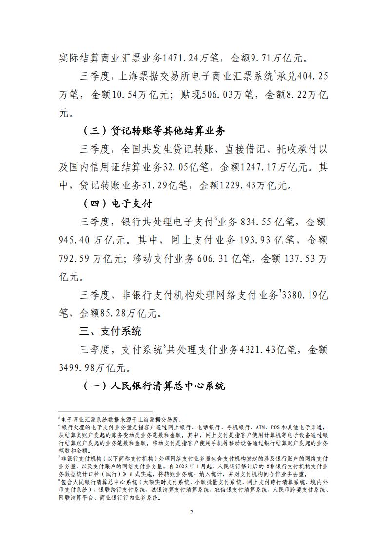 (一)人民银行清算总中心系统三季度,人民银行清算总中心系统共处理支付业务56.84亿笔,金额2632.51万亿元。日均处理业务6220.57万笔,金额38.80万亿元⁹。