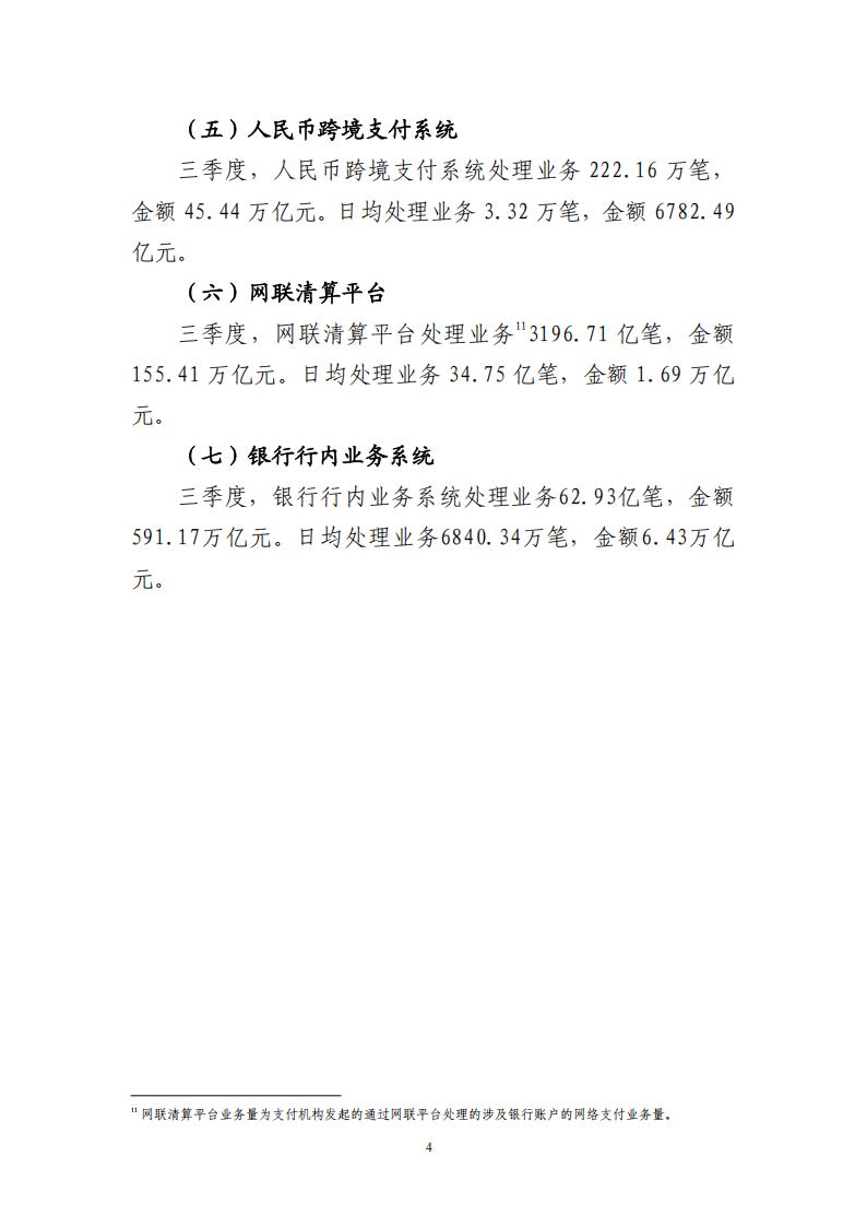 三季度,支付系统共处理支付业务4321.43亿笔,金额3499.98万亿元。