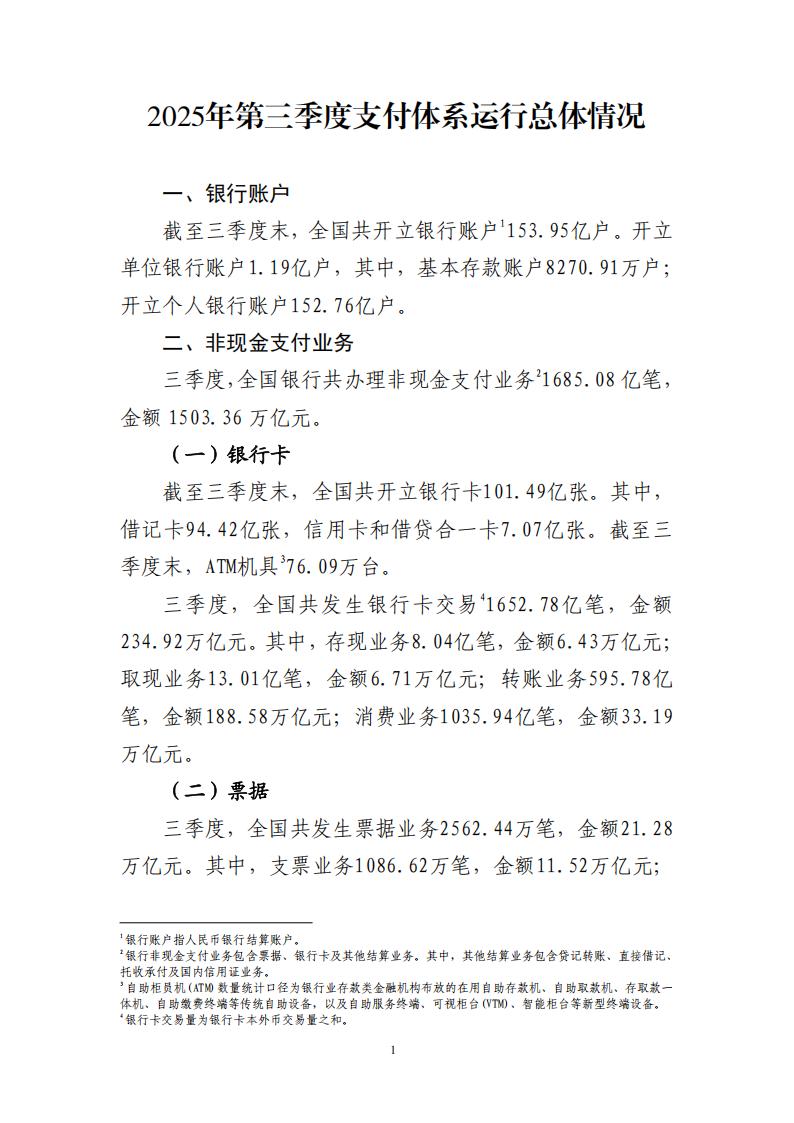 三季度,全国银行共办理非现金支付业务1685.08亿笔,金额1503.36万亿元。