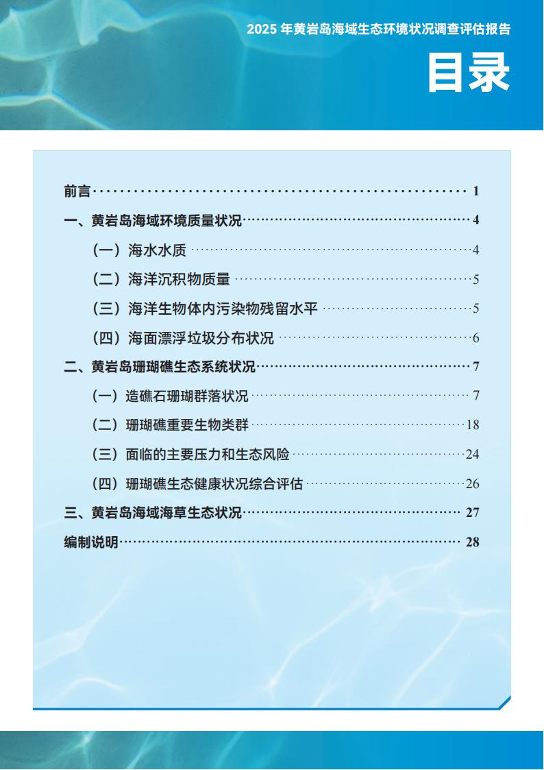 调查评估结果表明,黄岩岛海域环境质量持续为优,海水水质、海洋沉积物质量等级保持为一类,鱼类样品中的重金属、石油烃等污染物残留量均低于评价标准限值,海水、海洋沉积物和鱼类样品中均未检出氰化物。黄岩岛珊瑚礁生态系统健康稳定,本次调查共记录造礁石珊瑚14科39属134种,较2024年调查多记录25种,活珊瑚平均覆盖度为29.8%,珊瑚幼体补充量较高,珊瑚群落对海水温度升高具有较好的抵抗力和耐受性;礁栖生物多样性丰富,现场调查记录到礁栖鱼类24科145种,较2024年调查多记录20种;还记录到碎碟3种,以及壳状珊瑚藻、苍珊瑚、软珊瑚、海百合等;未发现珊瑚向大型藻类的相变,未发现珊瑚礁病害现象,长棘海星等敌害生物数量少。现场调查还在黄岩岛瀚湖内记录到3种海草分布,分别为圆叶丝粉草、卵叶喜盐草和针叶草。