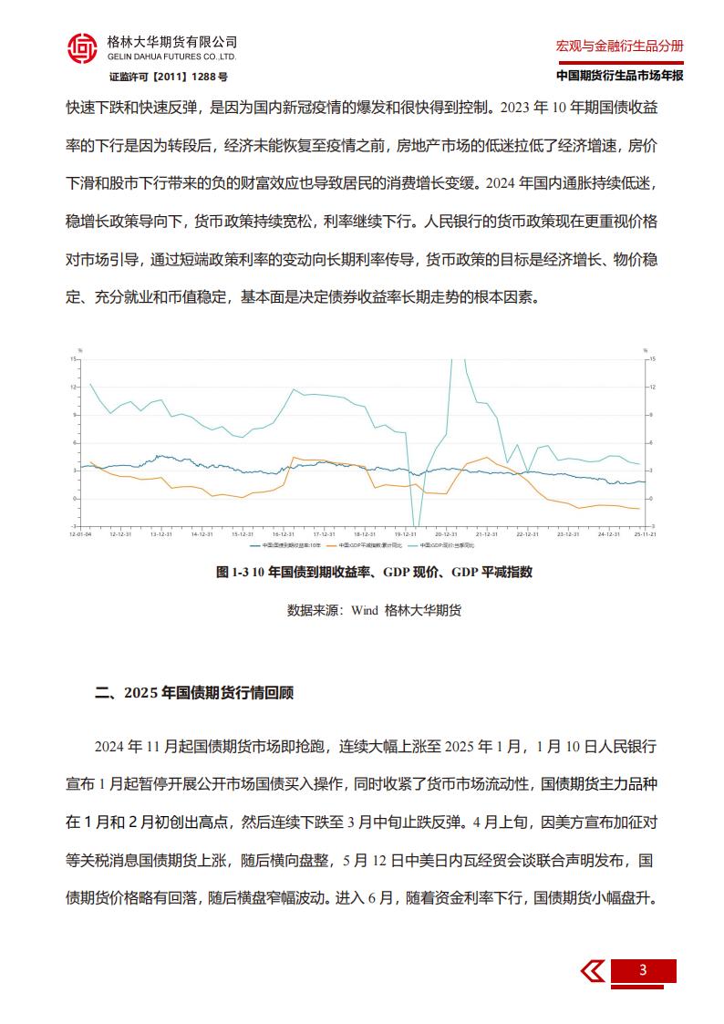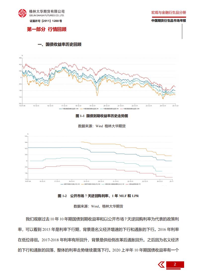 我们预期2026年中国货币政策总体继续宽松,小幅降息仍可能是央行的选择,上调政策性利率的概率较小。这样国债收益率曲线的短端存在继续下行的可能。国债收益率曲线的长端和超长端可能维持横向震荡。在国债收益率波动幅度相对有限,波动方向趋势不明显的情况下,国债期货适宜波段操作。我们观察过去10年10年期国债到期收益率和以公开市场7天逆回购利率为代表的政策利率,可以看到2015年是利率下行期,背景是名义经济增速的下行和通胀的下行。2016年利率在低位徘徊。2017-2018年利率有所回升,背景是供给侧改革后通胀回升。之后因为名义经济的下行和通胀的回落,整体的利率走势继续震荡下行。2020上半年10年期国债收益率有一个快速下跌和快速反弹,是因为国内新冠疫情的爆发和很快得到控制。2023年10年期国债收益率的下行是因为转段后,经济未能恢复至疫情之前,房地产市场的低迷拉低了经济增速,房价下滑和股市下行带来的负的财富效应也导致居民的消费增长变缓。2024年国内通胀持续低迷,稳增长政策导向下,货币政策持续宽松,利率继续下行。人民银行的货币政策现在更重视价格对市场引导,通过短端政策利率的变动向长期利率传导,货币政策的目标是经济增长、物价稳定、充分就业和币值稳定,基本面是决定债券收益率长期走势的根本因素。
