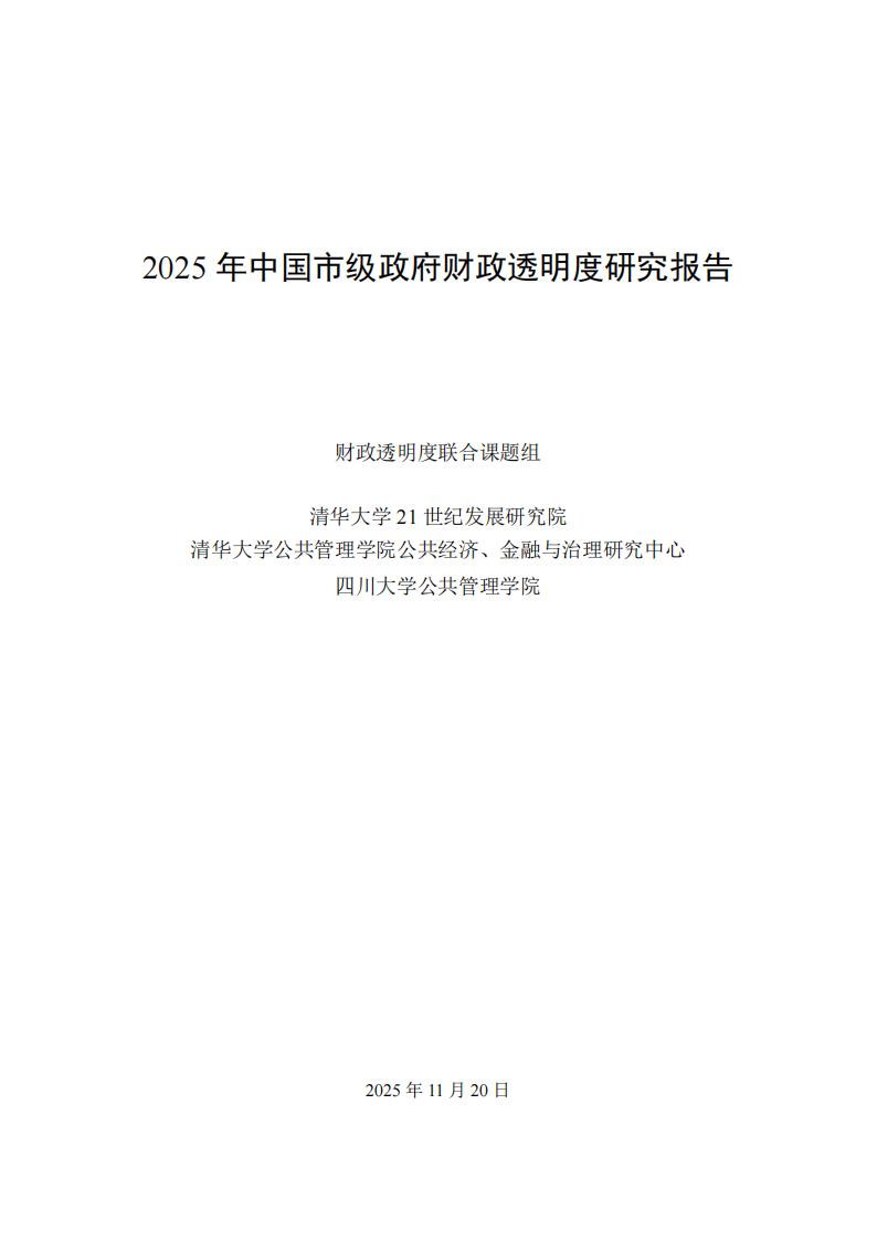 自2012年起,课题组每年定期发布《中国市级政府财政透明度研究报告》,本年度报告由清华大学21世纪发展研究院,清华大学公共管理学院公共经济、金融与治理研究中心,四川大学公共管理学院的联合课题组共同开展研究并撰写。本年度的研究在原有全口径指标体系基础上进行了若干微调及优化,以更好适应当前公共财政实践中出现的变化。同时,本年度报告基于全国296个地级及以上城市的财政公开数据,形成“2025年地级及地级以上市政府财政透明度排行榜”,对我国地级与地级以上市政府的财政公开情况进行了排序,旨在为地方政府改进财政公开工作提供参考,推动现代财政制度建设和治理能力提升。