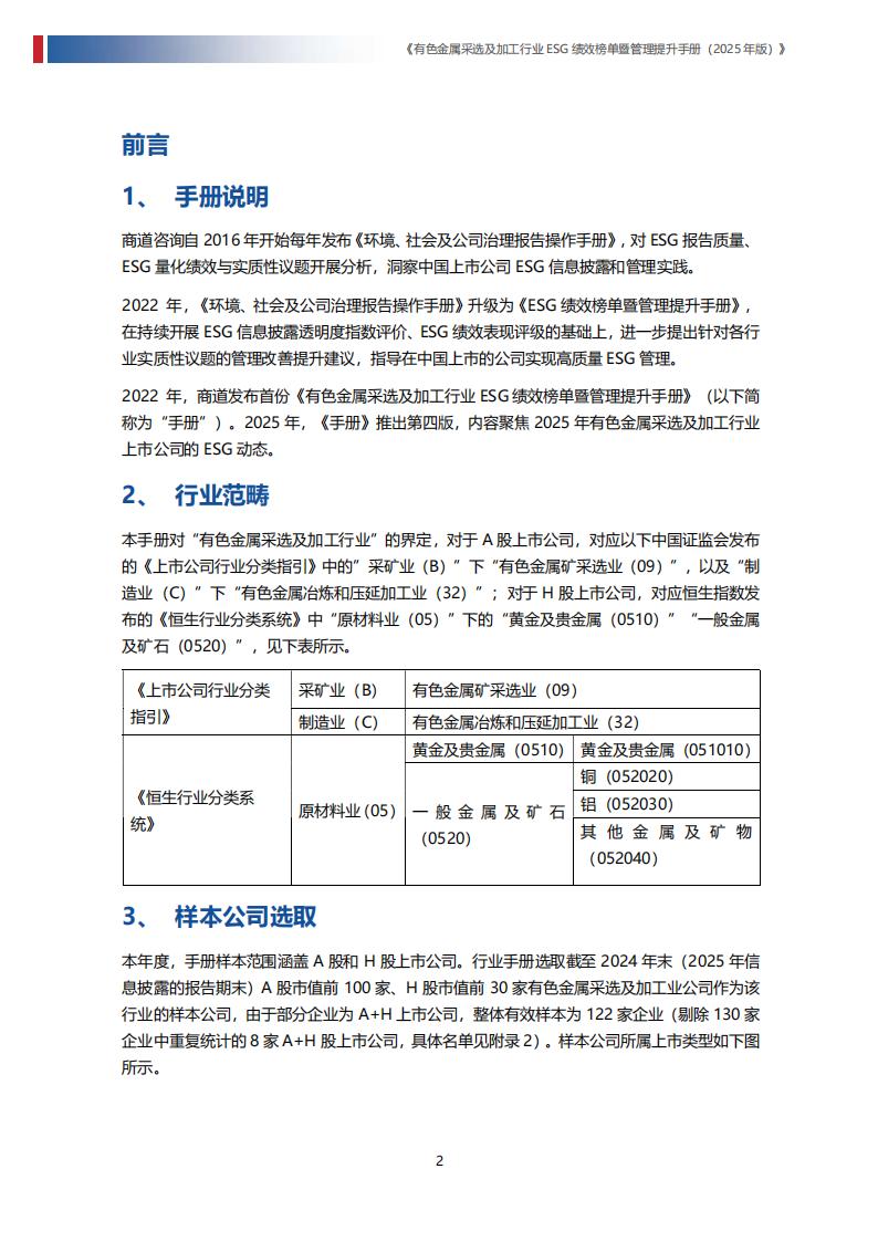 2022年,商道发布首份《有色金属采选及加工行业ESG绩效榜单暨管理提升手册》(以下简称为“手册”)。2025年,《手册》推出第四版,内容聚焦2025年有色金属采选及加工行业上市公司的ESG动态。