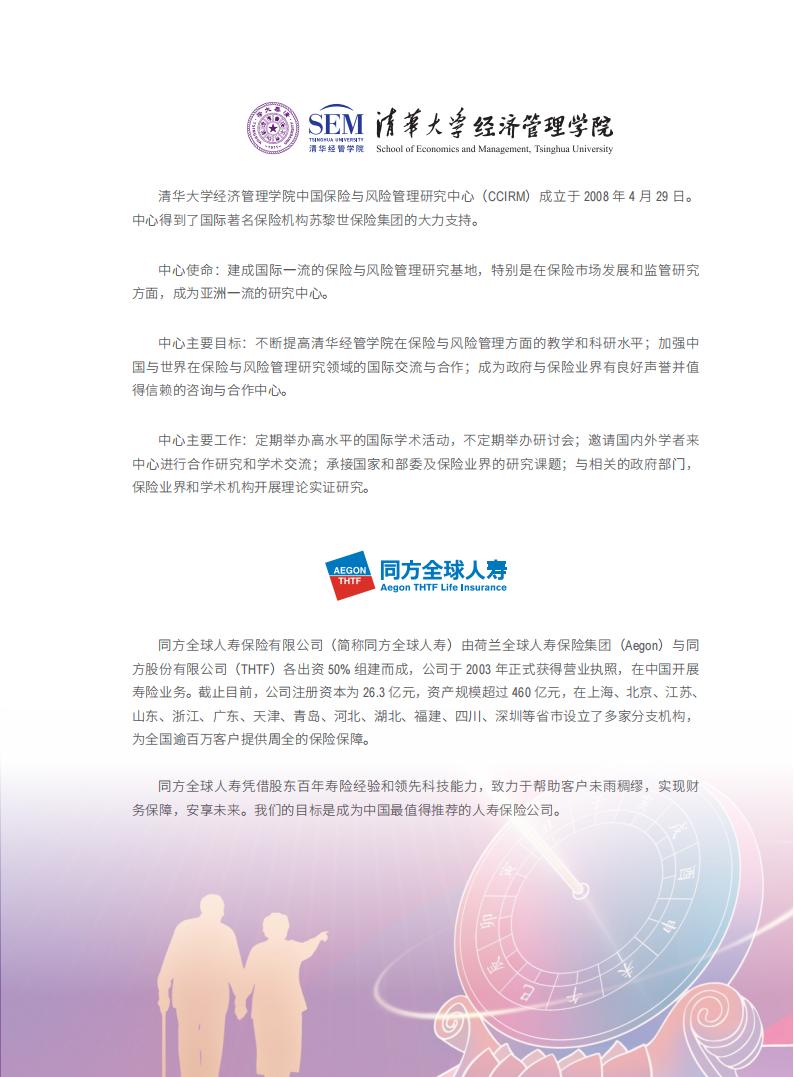 中心主要工作:定期举办高水平的国际学术活动,不定期举办研讨会;邀请国内外学者来中心进行合作研究和学术交流;承接国家和部委及保险业界的研究课题;与相关的政府部门,保险业界和学术机构开展理论实证研究。同方全球人寿保险有限公司(简称同方全球人寿)由荷兰全球人寿保险集团(Aegon)与同方股份有限公司(THTF)各出资50%组建而成,公司于2003年正式获得营业执照,在中国开展寿险业务。截止目前,公司注册资本为26.3亿元,资产规模超过460亿元,在上海、北京、江苏、山东、浙江、广东、天津、青岛、河北、湖北、福建、四川、深圳等省市设立了多家分支机构,为全国逾百万客户提供周全的保险保障。