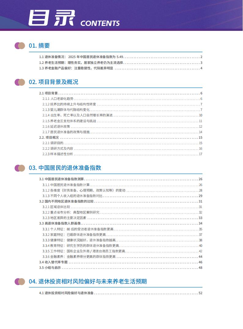 2025年中国居民退体准备指数(RR,Retirement Readiness Index)为5.49,相比于2024年的5.34略有上升。从六个核心维度来看,居民的退体贵任意识和财务规划认知水平显著提升,但退体计划完善度、储蓄充分度及对未来收入的信心仍处于相对低位,呈现出认知强化行动滞后、信心承压的结构性特征。这一结果反映出我国居民的退体难备巳进入从理念认知向行为转化的关键过阶段。