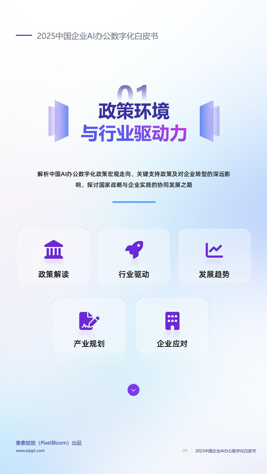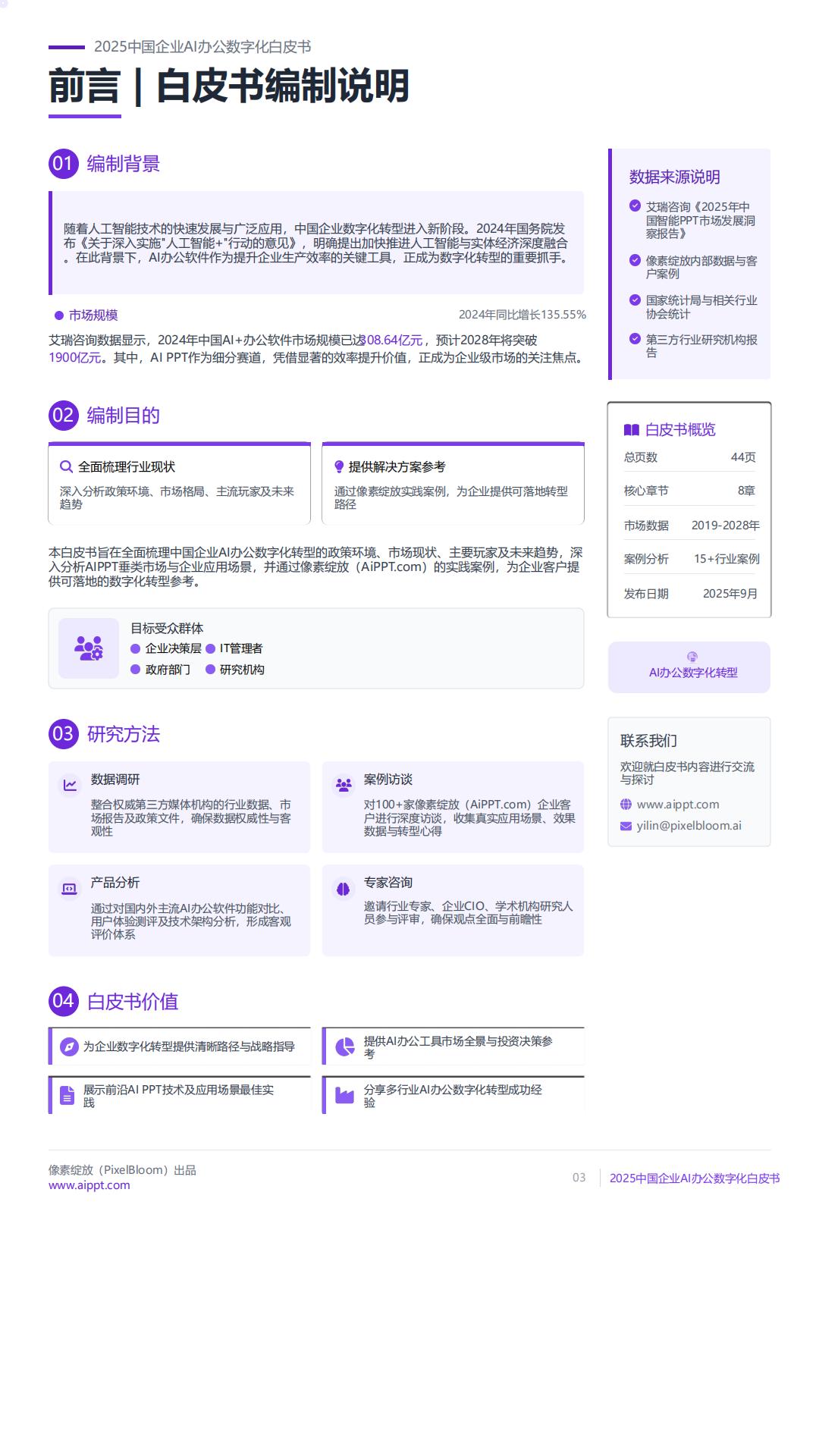 李拍皮书旨在全直梳理中国企业办公数字化转型的政策环境、市场现状,主要玩家及未来趋势,深人分析APPT垂类市场与企业应用场景,并遇过像素绽放(AiPPTcom)的实找案例,为企业客户提供可落地的数字化转型参考.