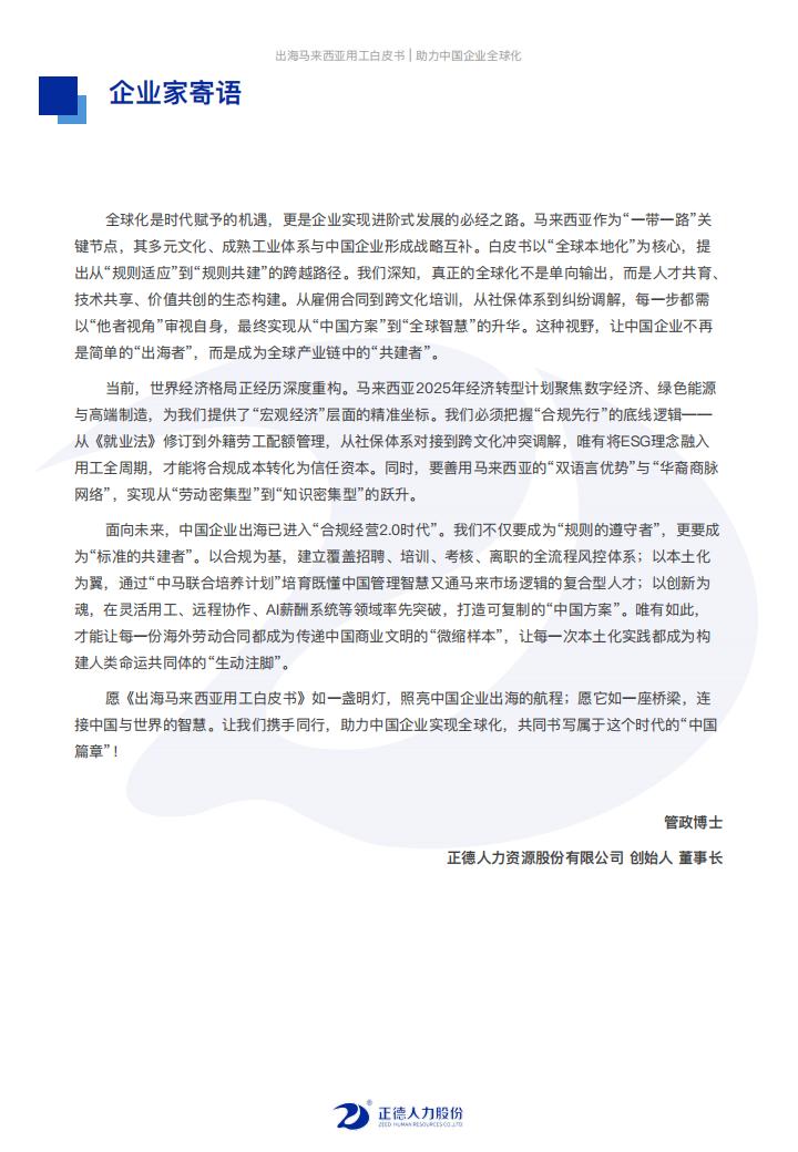愿《出海马来西亚用工白皮书》如一盏明灯,照亮中国企业出海的航程;愿它如一座桥梁,连接中国与世界的智慧。让我们携手同行,助力中国企业实现全球化,共同书写属于这个时代的“中国篇章”!