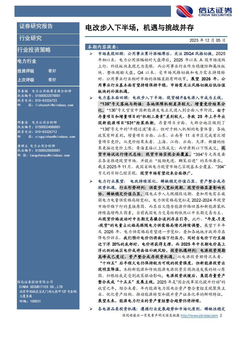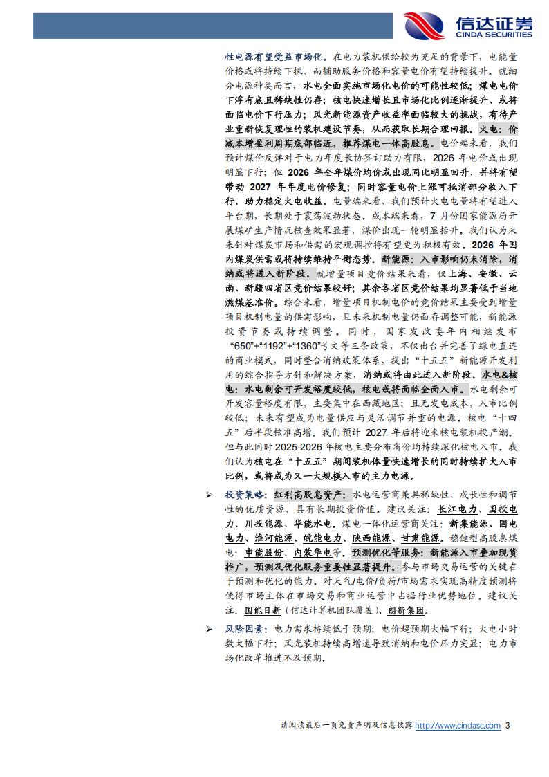 各电源品类投资机遇:遵循行业发展趋势和市场化原则,稀缺性稳定性电源有望受益市场化。在电力装机供给较为充足的背景下,电能量价格或将持续下探,而辅助服务价格和容量电价有望持续提升。就细分电源种类而言,水电全面实施市场化电价的可能性较低;煤电电价下浮有底且稀缺性仍存;核电快速增长且市场化比例逐渐提升、或将面临电价下行压力;风光新能源资产收益率面临较大的挑战,有待产业重新恢复理性的装机建设节奏,从而获取长期合理回报。火电:价减本增盈利周期底部临近,推荐煤电一体高股息。电价端来看,我们预计煤价反弹对于电力年度长协签订助力有限,2026年电价或出现明显下行;但2026年全年煤价均价或出现同比明显回升,并将有望带动2027年年度电价修复;同时容量电价上涨可抵消部分收入下行,助力稳定火电收益。电量端来看,我们预计火电电量将有望进入平台期,长期处于震荡波动状态。成本端来看,7月份国家能源局开展煤矿生产情况核查效果显著,煤价出现一轮明显抬升。我们认为未来针对煤炭市场和供需的宏观调控将有望更为积极有效。2026年国内煤炭供需或将持续维持平衡态势。新能源:入市影响仍未消除,消纳或将进入新阶段。就增量项目竞价结果来看,仅上海、安徽、云南、新疆四省区竞价结果较好;其余各省区竞价结果均显著低于当地燃煤基准价。综合来看,增量项目机制电价的竞价结果主要受到增量项目机制电量的供需影响,且未来机制电量仍面存调整可能,新能源投资节奏或持续调整。同时,国家发改委年内相继发布“650″+”1192″+”1360”号文等三条政策,不仅出台并完善了绿电直连的商业模式,同时整合消纳政策体系,提出“十五五”新能源开发利用的综合指导方针和解决方案,消纳或将由此进入新阶段。水电&核电:水电剩余可开发裕度较低,核电或将面临全面入市。水电剩余可开发容量裕度有限,主要集中在西藏地区;且无发电成本,入市比例较低;未来有望成为电量供应与灵活调节并重的电源。核电“十四五”后半段核准高增。我们预计2027年后将迎来核电装机投产潮。但与此同时2025-2026年核电主要分布省份均持续深化核电入市。我们认为核电在“十五五”期间装机体量快速增长的同时持续扩大入市比例,或将成为又一大规模入市的主力电源。