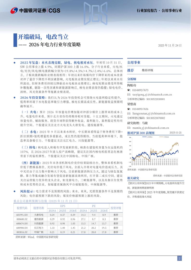 2026年投资策略:我们认为2026年投资机会可围绕火电盈利稳定性提升、低利率环境下水电股息率吸引力增强、核电长期高成长性、新能源收益预期明确等展开。