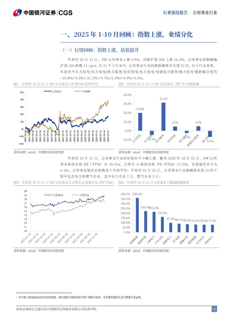 年初至10月31日,SW公用事业上涨4.9%,同期沪深300上涨16.0%,公用事业指数跑输沪深300指数11.1pct。在31个子行业中,公用事业行业的涨跌幅排名为第23名。分子行业来看,年初至今火力发电/水力发电/热力服务/光伏发电/风力发电/电能综合服务/核力发电涨跌幅分别为+19.8%/-4.5%/+31.3%/+4.7%/-2.4%/+4.9%/-6.6%。年初至10月31日,公用事业行业的估值水平小幅上涨。截至2025年10月31日,SW公用事业板块估值PE(TTM)为18.51x,万得全A板块估值PE(TTM)17.35x,估值溢价水平为6.6%,公用事业板块估值略高于市场平均。年初至10月31日,公用事业行业涨幅排名前10的个股中包含电力和燃气企业,其中电力企业7只,燃气企业3只。