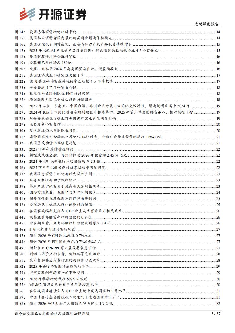 2、需求端:(1)外需方面,美国经济衰退可能性较小,一则消费增速保持稳定,AI投资成为经济增长新增量;二则2026年财政与货币政策相对宽松;三则关税政策趋于稳定,关税税率下降,企业预期得到改善。欧洲经济在德国财政刺激及欧央行降息的背景下,或也将维持温和增长。若美国AI资本开支与财政扩张带来的需求增量使全球贸易保持高景气度,预计2026年出口同比或将在+2%左右。
