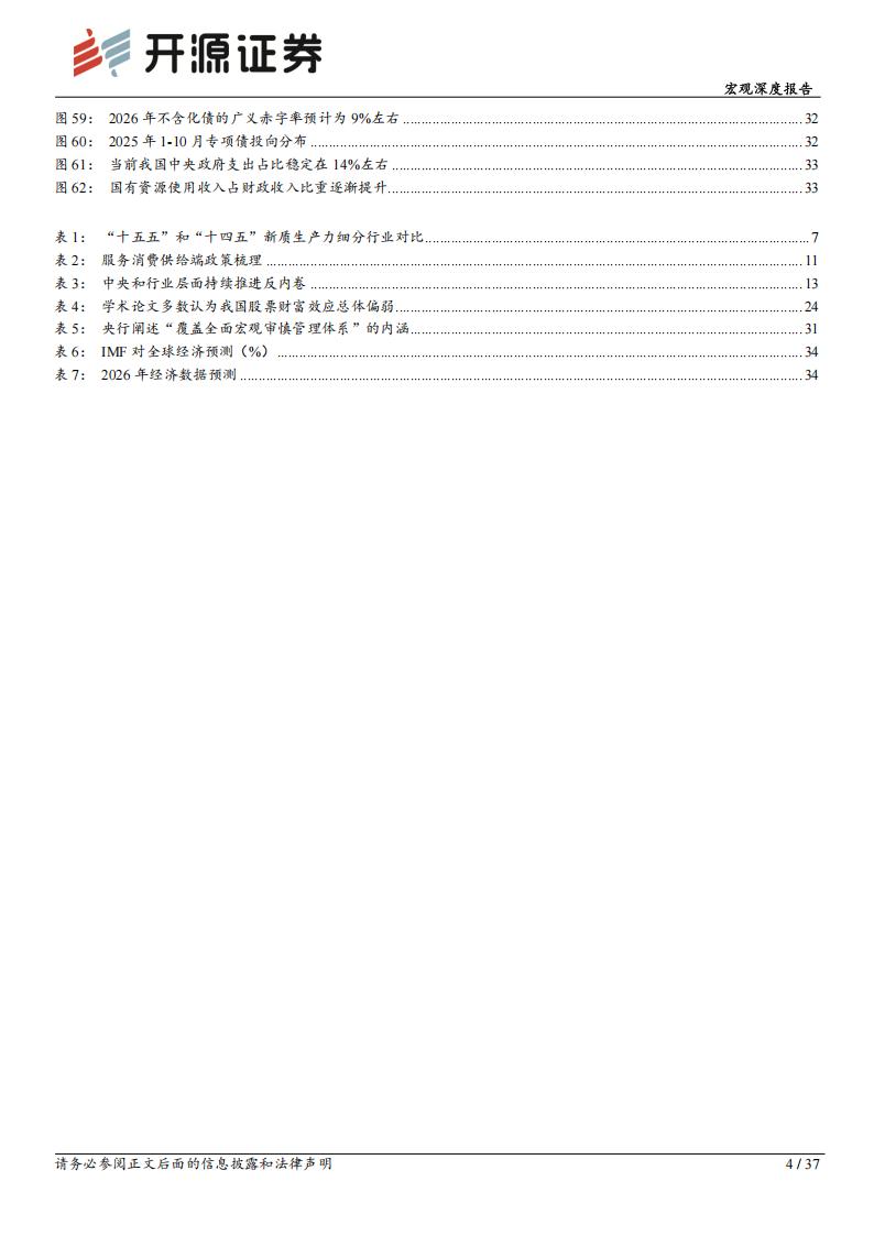 2、财政政策:更加积极,广义赤字规模有望扩大。判断2026年赤字率可能提升至4.2%,广义赤字规模可能增加1.7万亿,重点用于经济大省的投资建设、收购存量商品房、消化拖欠企业账款,以及加大对科技、民生消费的支持力度。财税改革方面,为增强财政可持续性,预计进一步优化税收结构、改善央地关系、加大存量资产盘活力度等。