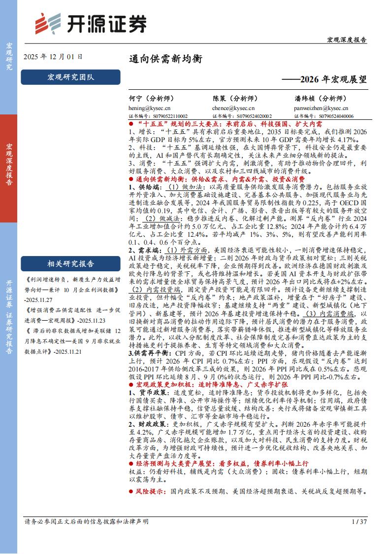 1、增长:“十五五”具有承前启后重要地位,2035目标要完成,我们推测2026年实际GDP目标为5%左右,官方预测未来10年GDP需要年均增长4.17%。