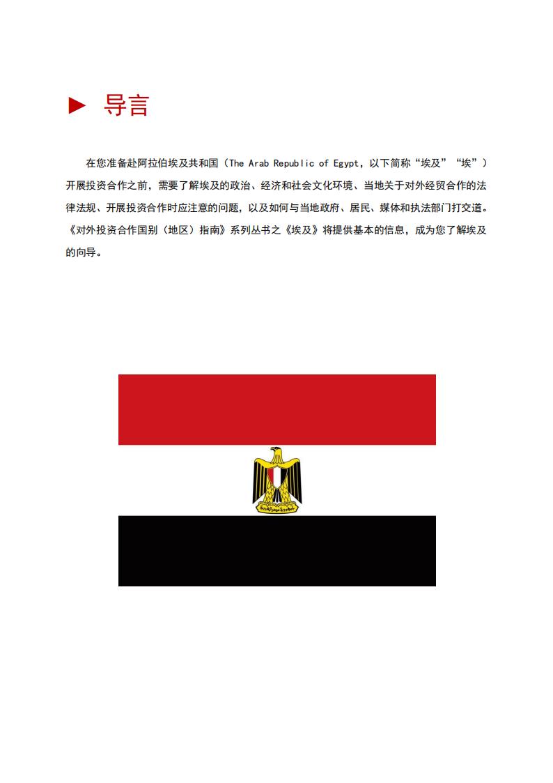 在您准备赴阿拉伯埃及共和国(TheArabRepublicofEgypt,以下简称“埃及”“埃”)开展投资合作之前,需要了解埃及的政治、经济和社会文化环境、当地关于对外经贸合作的法律法规、开展投资合作时应注意的问题,以及如何与当地政府、居民、媒体和执法部门打交道。《对外投资合作国别(地区)指南》系列丛书之《埃及》将提供基本的信息,成为您了解埃及的向导。