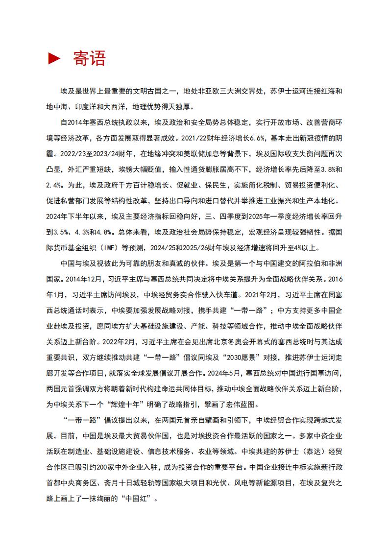“一带一路”倡议提出以来,在两国元首亲自擘画和引领下,中埃经贸合作实现跨越式发展。目前,中国是埃及最大贸易伙伴国,也是对埃投资合作最活跃的国家之一。多家中资企业活跃在制造业、基础设施建设、信息技术服务、农业等领域。中埃共建的苏伊士(泰达)经贸合作区已吸引约200家中外企业入驻,成为投资合作的重要平台。中国企业接连中标实施新行政首都中央商务区、斋月十日城轻轨等国家级大项目和光伏、风电等新能源项目,在埃及复兴之路上画上了一抹绚丽的“中国红”。展望未来,中埃两国将以两国元首重要共识为指引,秉承“共商共建共享”原则,深入落实第三届“一带一路”国际合作高峰论坛、首届中阿峰会、中非合作论坛、中阿合作论坛等重要成果,深化各领域务实合作,推动共建“一带一路”高质量发展。中国企业可充分利用埃及独特的地理区位、便利的国际贸易条件和具有竞争力的要素成本等优势,稳步推进对埃制造业、数字经济、绿色经济、基础设施建设、农业等领域投资合作,积极履行社会责任,实现合作共赢,增进两国人民福祉。