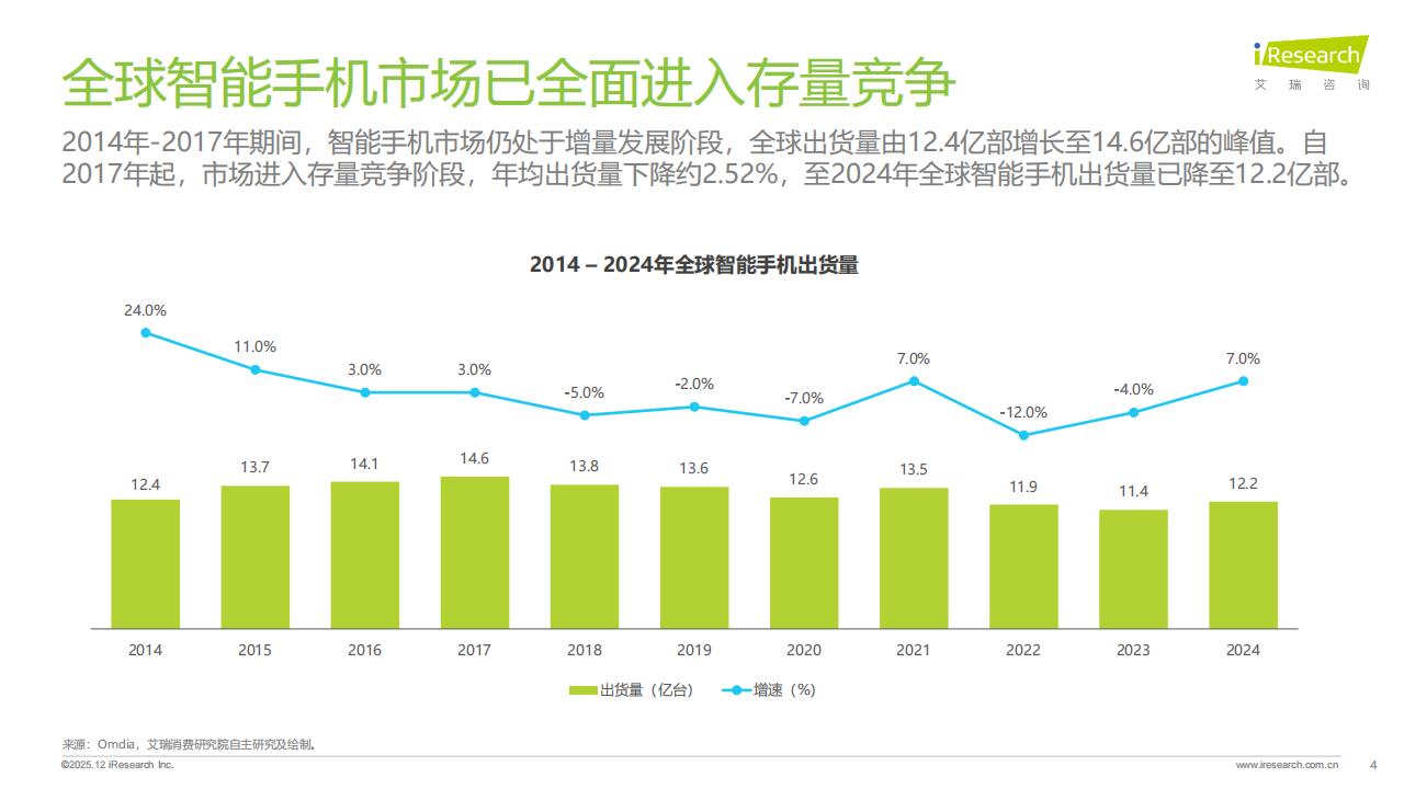2014年-2017年期间,智能手机市场仍处于增量发展阶段,全球出货量由12.4亿部增长至14.6亿部的峰值。自2017年起,市场进入存量竞争阶段,年均出货量下降约2.52%,至2024年全球智能手机出货量已降至12.2亿部。直板智能手机市场已趋于饱和,近年来增长势头放缓。各大厂商亟需通过创新产品形态以开拓高端市场。折叠屏手机凭借“形态革新”重新定义了用户体验,2022年-2024年出货量均保持高速增长,已成为智能手机实现技术突破与品牌升级的重要战略载体。折叠屏技术历经从概念探索、核心硬件可靠性攻关,到软件生态优化及形态边界拓展的持续演进过程。当前,折叠屏手机正朝着更高耐用性、更优用户体验以及更多样化形态的方向加速发展。