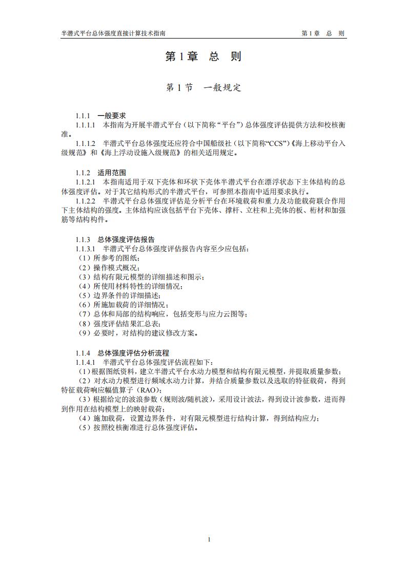 1.1.1.2半潜式平台总体强度还应符合中国船级社(以下简称“CCS”)《海上移动平台入级规范》和《海上浮动设施入级规范》的相关适用规定。