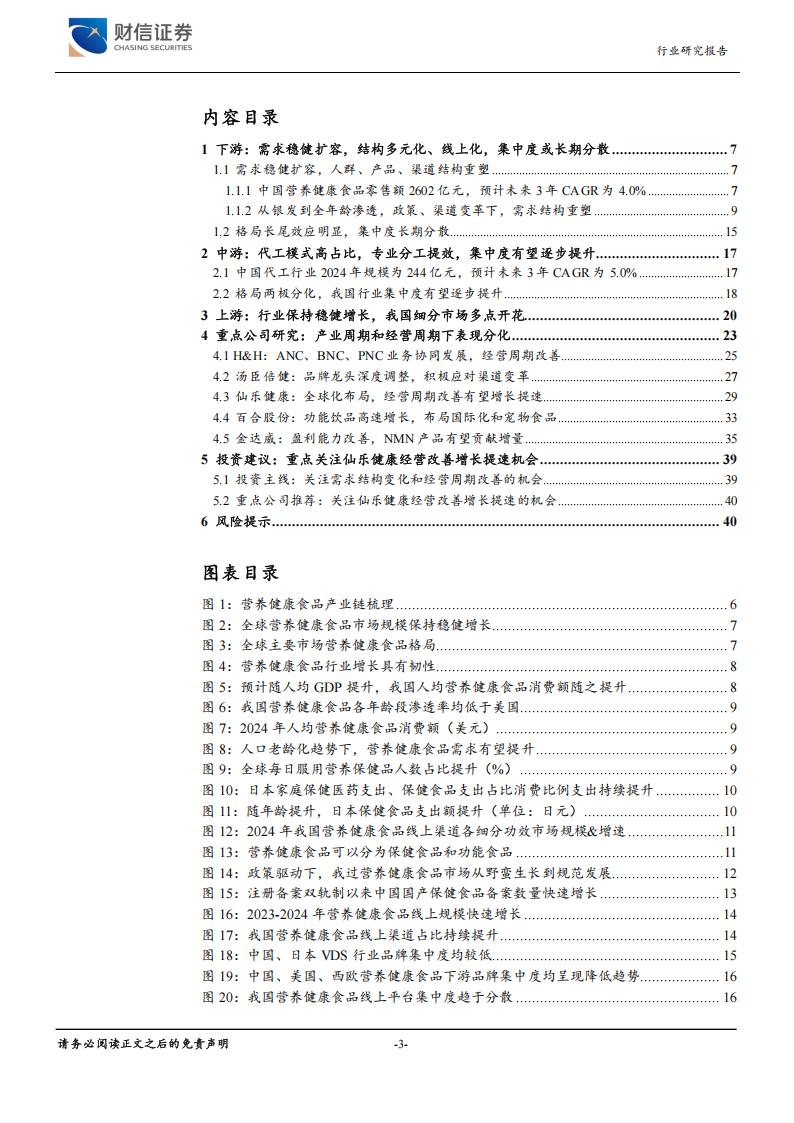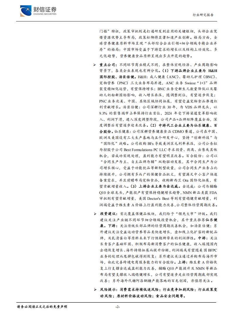 重点公司:不同环节商业模式不同,在整体宏观经济、产业周期影响背景下,各类企业表现也有所分化。(1)下游品牌企业主要为H&H国际控股、汤臣倍健。H&H:成人健康(ANC)、婴幼儿护理(BNC)、宠物营养(PNC)三大业务布局并进,ANC业务Swisse“1+3”品牌裂变精细化运营,有望保持增长;BNC业务受新生儿数量降低以及婴幼儿奶粉新国标影响,收入增长承压,随调整到位,有望逐步恢复;PNC业务北美、中国、其他区域协同拓展,有望受益宠物食品渗透红利贡献增长。汤臣倍健:公司深耕行业30年,为VDS品牌龙头,以9.3%的零售端市占率保持行业首位,2024年受下游渠道变革影响收入、利润下滑,进入深度调整阶段,公司产品+品牌矩阵覆盖全面,深度调整后有望逐步迎来改善。(2)中游代工企业主要为仙乐健康、百合股份。仙乐健康:公司深耕营养健康食品CDMO赛道,公司在中国、欧洲及美国设有三大生产基地与五个研发中心,坚持“创新科技”与“国际化”战略。公司收购BFs导致美洲区毛利率承压,公司公告拟为控股子公司Best Formu lations PC LLC寻求投资、剥离、出售或其他机会,若成功实现处理,盈利能力有望明显改善。百合股份:公司以“合同生产为主、自主品牌为辅”双轮驱动发展,其中合同生产为公司增长核心,受益于功能饮品等新剂型放量,公司合同生产业务占比持续提升,公司拥有多而广的保健食品批文,有望满足中小客户快速备案需求,并且前瞻布局宠物食品,收购新西兰Ora国际化拓展,有望贡献增量收入。(3)上游企业主要为金达威。金达威:公司为辅酶Q10全球龙头,产能投产有望保持稳健增长趋势,NMN新品类获FDA审批则有望贡献增量,美国Doctor’s Best等则有望稳健贡献增量,利润端受益于维生素A价格上行盈利能力改善,公司整体经营周期改善。