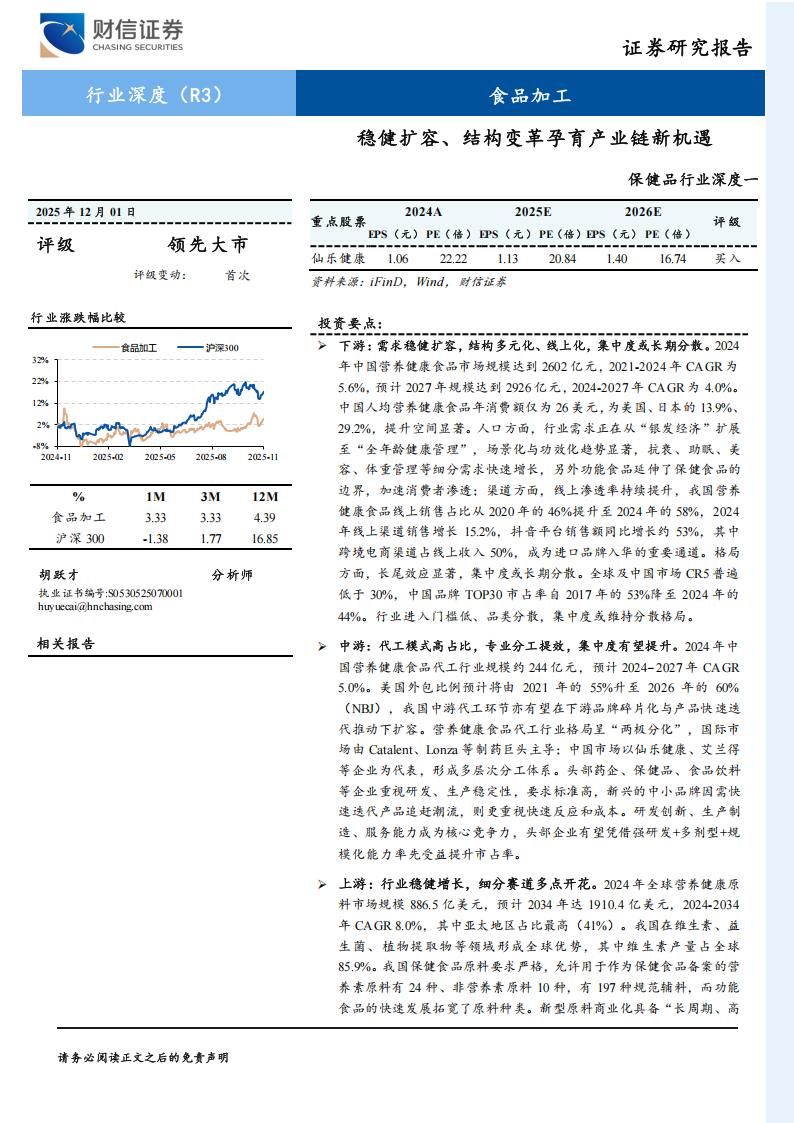 投资建议:首次覆盖保健品板块,我们给予“领先大市”评级。我们建议关注产业链不同环节细分领域投资机会,其中重点推荐仙乐健康。下游:关注传统头部品牌的经营周期改善机会,如汤臣倍健;另外建议关注受益运动营养等品类快速增长,叠加线上化扩容的新锐品牌,及乳清蛋白等原料未来下行预期所带来的利润弹性。中游:关注长青客户基础牢固、积极布局新消费客户的仙乐健康,收入端随国内企稳恢复增长、海外持续拓展而提升份额,利润端或有望随美国BFPC业务的处理而甩掉包袱得到恢复;另外建议关注通过并购布局海外市场,由此完善跨境电商服务能力的百合股份。上游:维生素A价格恢复上行支撑金达威盈利能力改善,辅酶Q10产能提升及NMN等新品布局有望支撑收入端稳健增长,公司有望逐步走出经营周期底部实现改善;另外海外代糖阿洛酮糖产能落地的百龙创园,亦值得关注。