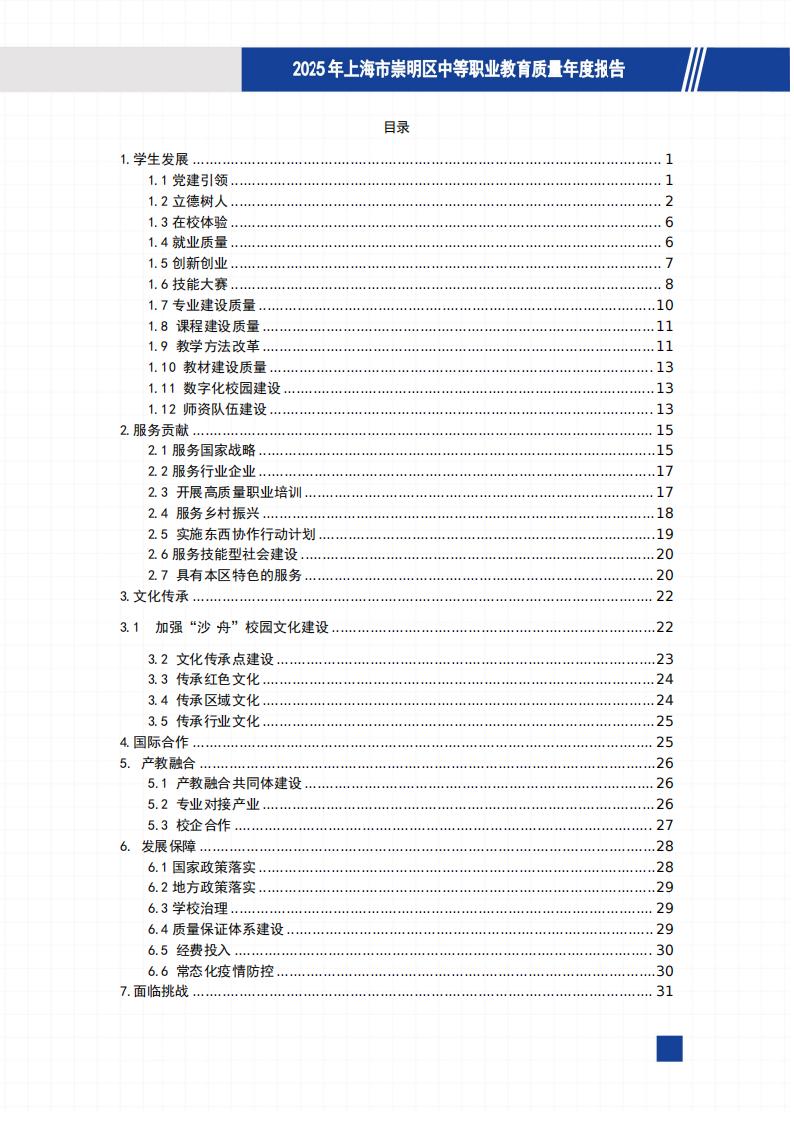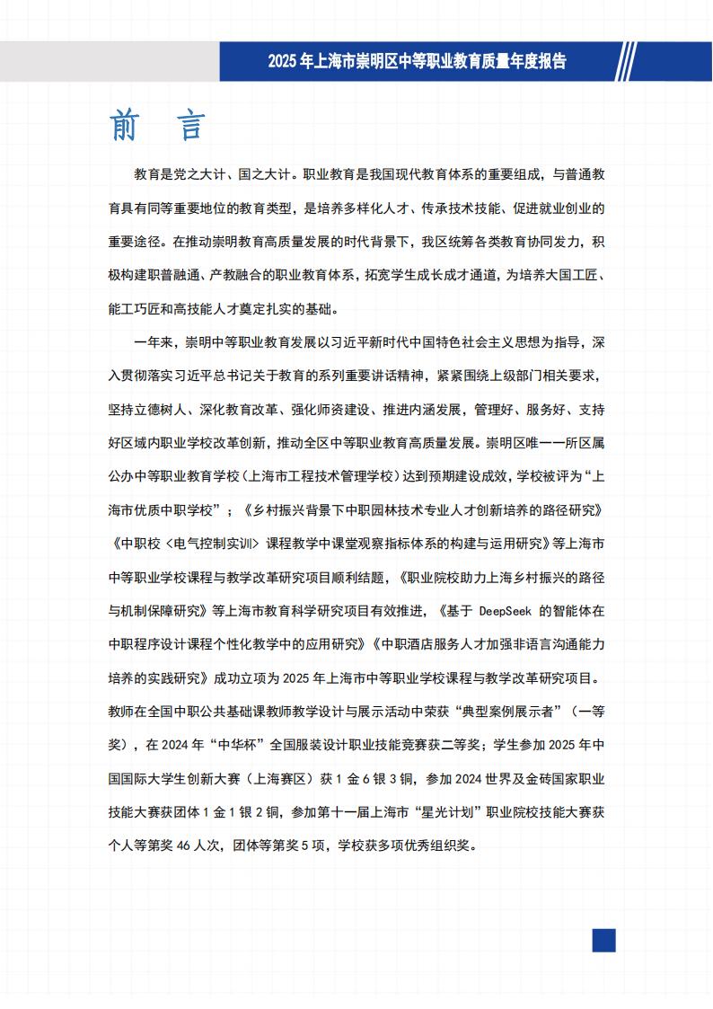 一年来,崇明中等职业教育发展以习近平新时代中国特色社会主义思想为指导,深入贯彻落实习近平总书记关于教育的系列重要讲话精神,紧紧围绕上级部门相关要求,坚持立德树人、深化教育改革、强化师资建设、推进内涵发展,管理好、服务好、支持好区域内职业学校改革创新,推动全区中等职业教育高质量发展。崇明区唯——所区属公办中等职业教育学校(上海市工程技术管理学校)达到预期建设成效,学校被评为“上海市优质中职学校”;《乡村振兴背景下中职园林技术专业人才创新培养的路径研究》《中职校<电气控制实训>课程教学中课堂观察指标体系的构建与运用研究》等上海市中等职业学校课程与教学改革研究项目顺利结题,《职业院校助力上海乡村振兴的路径与机制保障研究》等上海市教育科学研究项目有效推进,《基于DeepSeek的智能体在中职程序设计课程个性化教学中的应用研究》《中职酒店服务人才加强非语言沟通能力培养的实践研究》成功立项为2025年上海市中等职业学校课程与教学改革研究项目。教师在全国中职公共基础课教师教学设计与展示活动中荣获“典型案例展示者”(一等奖),在2024年“中华杯”全国服装设计职业技能竞赛获二等奖;学生参加2025年中国国际大学生创新大赛(上海赛区)获1金6银3铜,参加2024世界及金砖国家职业技能大赛获团体1金1银2铜,参加第十一届上海市“星光计划”职业院校技能大赛获个人等第奖46人次,团体等第奖5项,学校获多项优秀组织奖。