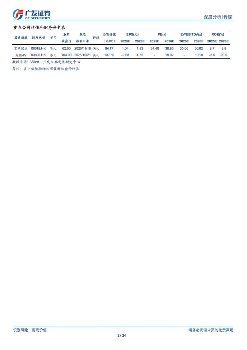外流、线上医保和国补的政策趋势,保健品线上渗透已较为成熟,但新品竞争的特征会带来广告投流的增长,为平台带来广告收入的增加。在渠道端,今年大厂即时零售竞争加剧,9月以来加大非餐领域的布局,有望与互联网医疗平台实现业务协同、带来赋能;Al问诊的持续完善有望为平台药品的销售带来导流,看好互联网医疗平台未来的发展空间。推荐京东健康、美团,建议关注阿里健康、平安好医生等。