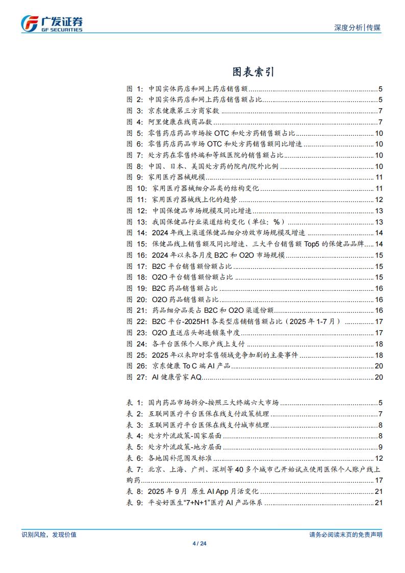平台带来导流。(1)当前的020和B2C两大渠道中,B2C主要玩家包括京东、天猫两大平台,020药品市场规模小于B2C,主要玩家包括美团、饿了么和京东到家,其中美团占据接近80%份额。02O在零售药店销售额当中的占比不断提升,今年8月同比提升1.7pct至8.9%;代表的药品特征来看,B2C平台处方药占比稍高,020渠道中仍以OTC为主;从药品供应来看,B2C偏自营,020以线下药店直送为主要来源。(2)渠道方面存在的机遇,2025年以来,即时零售竞争态势激烈,大厂皆加强布局,尤其是9月以来,对非餐品类的布局加深。其中,京东大药房的线下实体店落地,有望实现自营的供应链优势与即时零售业务的协同。(3)AI问诊赋能,Al技术正重塑医疗领域的服务模式与运营效率,对于互联网医疗平台来说,通过生态内药品商城的布局在问诊结束后推送药品链接、或通过连接真实医疗资源,实现服务闭环,并且可以提供020或B2C买药服务,在互联网医疗平台实现收入闭环。