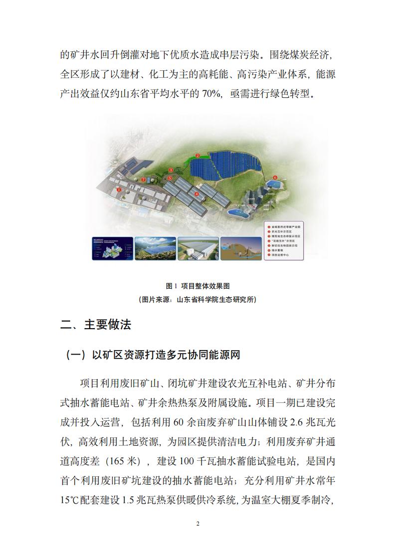 项目利用废旧矿山、闭坑矿井建设农光互补电站、矿井分布式抽水蓄能电站、矿井余热热泵及附属设施。项目一期已建设完成并投入运营,包括利用60余亩废弃矿山山体铺设2.6兆瓦光伏,高效利用土地资源,为园区提供清洁电力;利用废弃矿井通道高度差(165米),建设100千瓦抽水蓄能试验电站,是国内首个利用废旧矿坑建设的抽水蓄能电站;充分利用矿井水常年15℃配套建设1.5兆瓦热泵供暖供冷系统,为温室大棚夏季制冷,冬季供热。目前项目二期正在建设中,建成后将实现11.3兆瓦光伏电站、12兆瓦×4小时抽水蓄能电站、12兆瓦冷热源的能力。