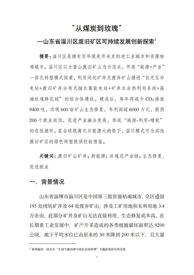 摘要:淄川区是拥有百年煤炭开采史的老工业城市和资源枯竭城市。淄川区以大奎山废旧矿山为示范点,开展“能源+产业”一体化转型模式探索,利用闭坑矿井及废弃矿山推进“农光互补电站+废旧矿井分布式抽水蓄能电站+矿井水余热利用系统+高端玫瑰鲜花链”的综合体建设。建成后,每年将减少CO₂排放9400吨,实现600亩矿山生态修复,年利润超6000万元,提供200个就业岗位,促进产业融合发展,形成“减排-利用-增效”的良性循环。在全球脱离化石能源大趋势下,淄川模式可为其他废旧矿区的绿色转型提供经验借鉴。