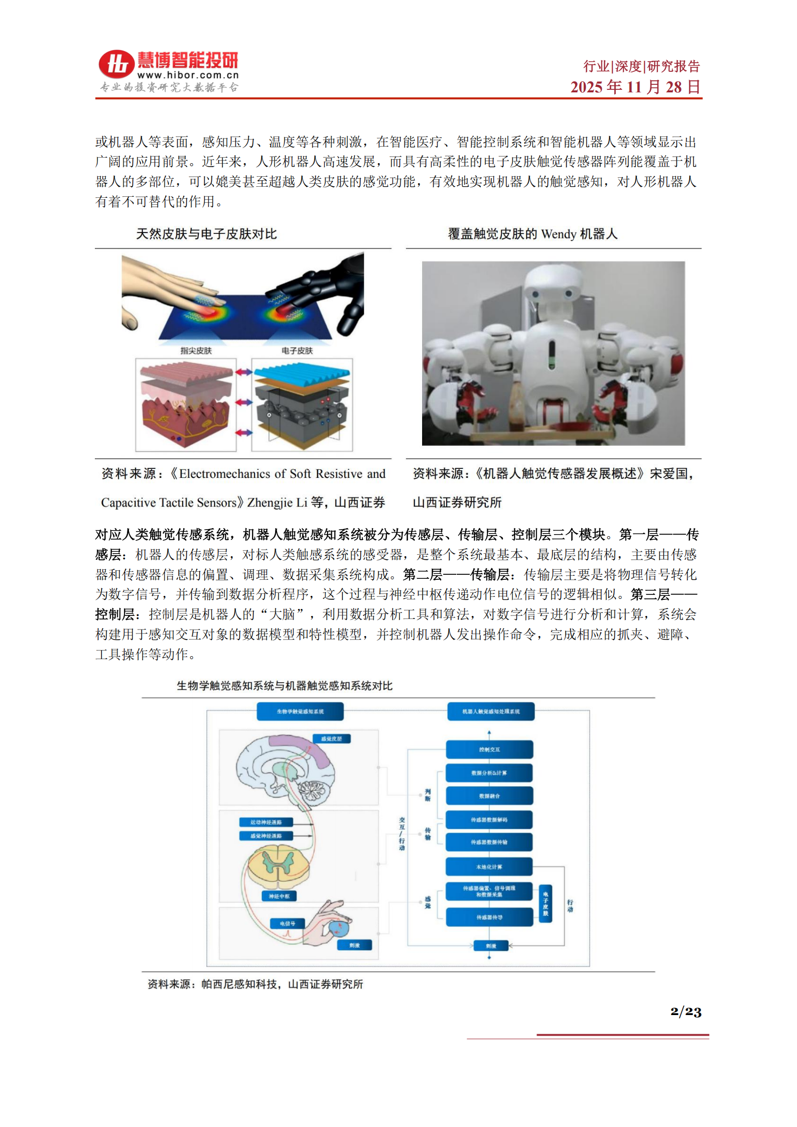 电子皮肤是模仿天然皮肤而形成的柔性触觉传感器系统。皮肤是人体最大的器官,是一种多功能传感器能够清晰地感知外部环境的变化,对人类的生存和发展具有重要的意义。而电子皮肤则是一种模拟天然皮肤功能的仿生柔性触觉传感器系统,可以模仿人体皮肤的触觉传感功能和灵活性能,附着在人体皮肤或机器人等表面,感知压力、温度等各种刺激,在智能医疗、智能控制系统和智能机器人等领域显示出广阔的应用前景。近年来,人形机器人高速发展,而具有高柔性的电子皮肤触觉传感器阵列能覆盖于机器人的多部位,可以媲美甚至超越人类皮肤的感觉功能,有效地实现机器人的触觉感知,对人形机器人有着不可替代的作用。对应人类触觉传感系统,机器人触觉感知系统被分为传感层、传输层、控制层三个模块。第一层——传感层:机器人的传感层,对标人类触感系统的感受器,是整个系统最基本、最底层的结构,主要由传感器和传感器信息的偏置、调理、数据采集系统构成。第二层——传输层:传输层主要是将物理信号转化为数字信号,并传输到数据分析程序,这个过程与神经中枢传递动作电位信号的逻辑相似。第三层——控制层:控制层是机器人的“大脑”,利用数据分析工具和算法,对数字信号进行分析和计算,系统会构建用于感知交互对象的数据模型和特性模型,并控制机器人发出操作命令,完成相应的抓夹、避障、工具操作等动作。