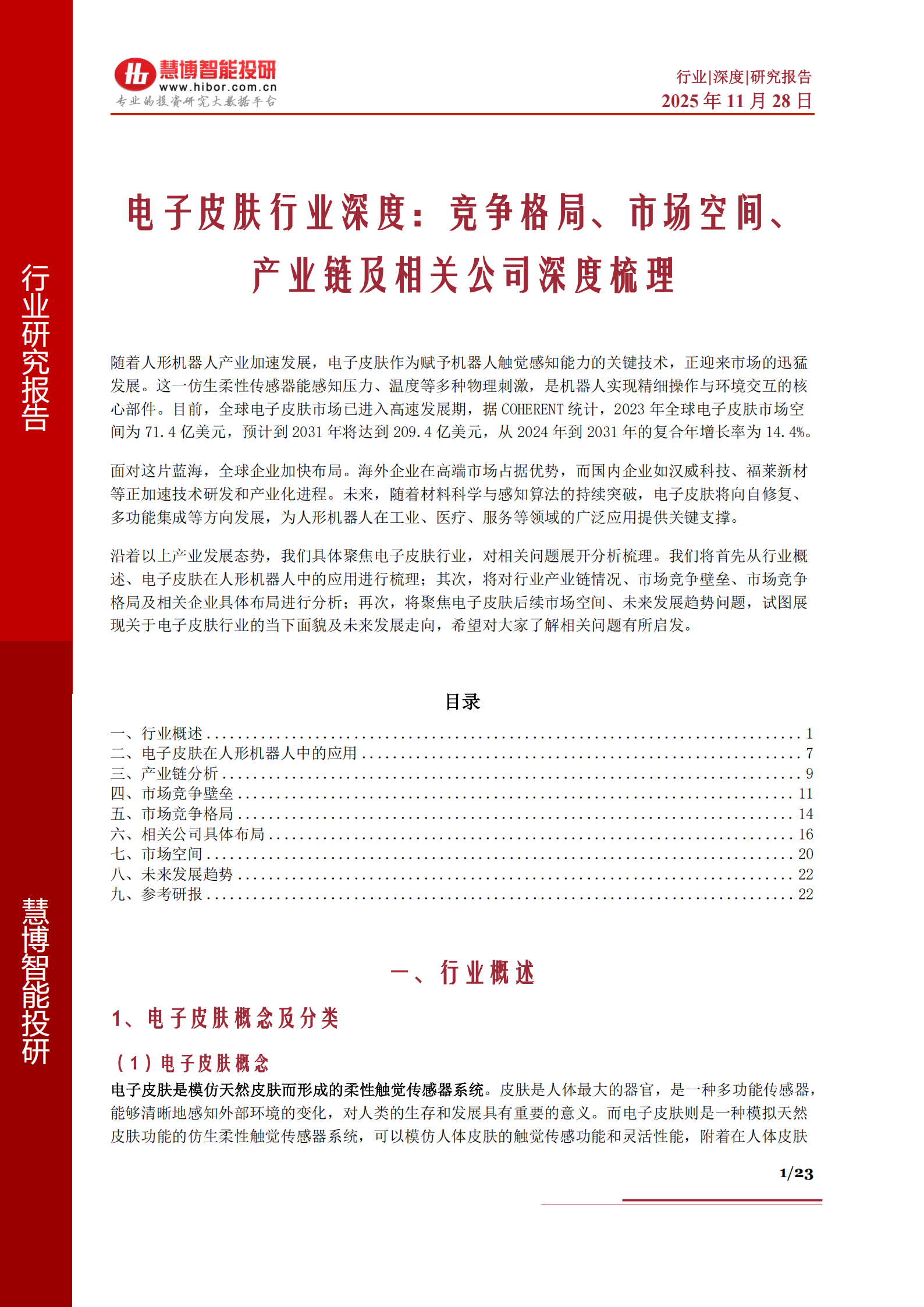 沿着以上产业发展态势,我们具体聚焦电子皮肤行业,对相关问题展开分析梳理。我们将首先从行业概述、电子皮肤在人形机器人中的应用进行梳理;其次,将对行业产业链情况、市场竞争壁垒、市场竞争格局及相关企业具体布局进行分析;再次,将聚焦电子皮肤后续市场空间、未来发展趋势问题,试图展现关于电子皮肤行业的当下面貌及未来发展走向,希望对大家了解相关问题有所启发。