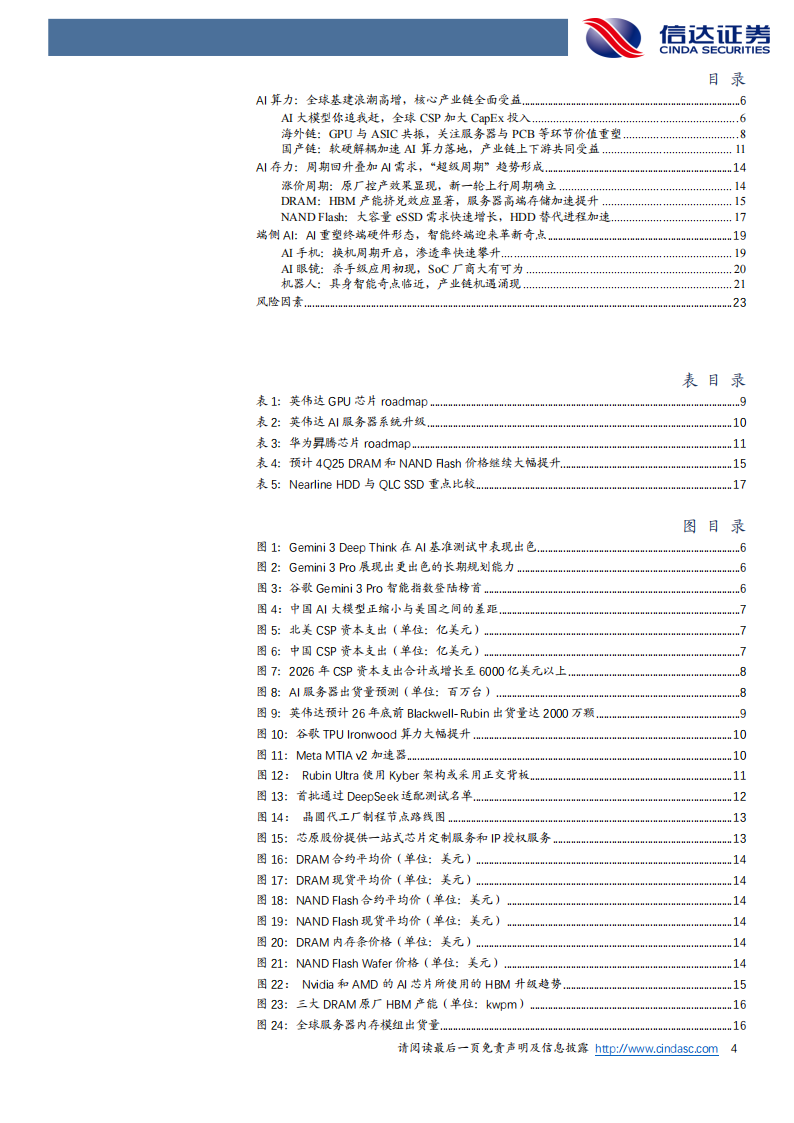 Al存力:周期回升叠加Al需求,“超级周期”趋势形成。存储原厂坚定的减产保价策略已逐步扭转供需格局,DRAM和NAND Flash价格步入上行通道。回顾过去几个季度,主要存储原厂通过严格控制晶圆投片量和优化库存结构,成功推动了存储价格触底反弹。从合约价和现货价走势来看,DRAM和NAND Flash均已走出一波明显的上涨行情。展望2026年,鉴于原厂在扩产方面依旧保持谨慎,且新增产能主要集中在HBM等高端产品,我们预计常规存储产品的供需将持续处于紧平衡状态,价格中枢有望进一步抬升。DRAM方面:HBM产能挤兑效应显著,服务器高端存储加速提升。三大原厂积极扩产HBM,产能挤兑效应或将导致通用DRAM进一步供应紧张。在服务器端,DDR5内存已成为新建数据中心的标配。此外,AI服务器对内存容量的渴求推动了64GB/128GB等高容量RDIMM模组的出货占比提升,进一步拉动了DRAM位元出货量的增长。NAND Flash方面:大容量eSSD需求快速增长,HDD替代进程加速。Al训练对数据吞吐的高要求,正在催化QLC eSSD加速替代Nearline HDD。在AI大模型训练和推理过程中,存储设备的读写速度直接影响整体计算效率。Al创造的庞大数据量正冲击全球数据中心存储设施,传统作为海量数据存储基石的Nearline HDD(近线硬盘)已出现供应短缺,促使高效能、高成本的SSD逐渐成为市场焦点,根据TrendForce,大容量的QLC SSD出货可能于2026年出现大幅增长。