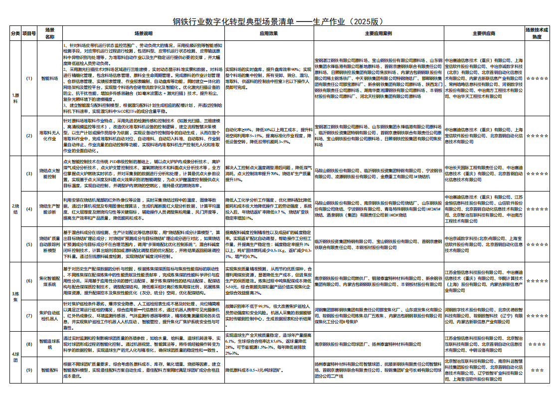 中国钢铁工业协会牵头组织重点企业、数字化解决方案供应商、高校及科研院所,以工业和信息化部“一图四清单”为指导,以《钢铁行业智能制造解决方案推荐目录(2021-2024年)》案例为基础,以生产作业环节为切入点,系统梳理行业数字化转型的痛点与需求。通过遴选技术较为成熟、应用效果突出的典型案例,编制了本清单,旨在通过标准化的场景要素,为钢铁企业提供切实可行的转型抓手,为服务商提供精准的需求导向,打造供需双方协同推进的纽带。