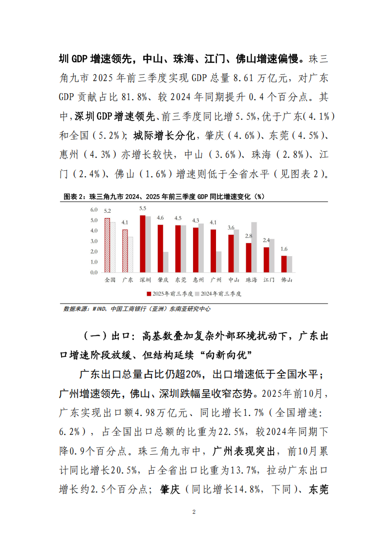 回顾2025年,高基数叠加复杂外部环境扰动,前10月广东出口增速(1.7%)阶段性放缓,结构持续“向新向优”调整,对“一带一路”市场特别是东盟出口增长强劲,机电产品、中间品及“新三样”等高技术产品出口表现亮眼。投资动能延续转换,前10月广东投资总量增速(-15.2%)低于全国水平,新质生产力导向的制造业投资延续高增长,制造业投资结构延续向“新”。前10月广东消费总量同比较2024年同期提速1.8个百分点、珠三角九市消费增速低于全国水平,下半年“以旧换新”相关商品消费增速有所放缓。