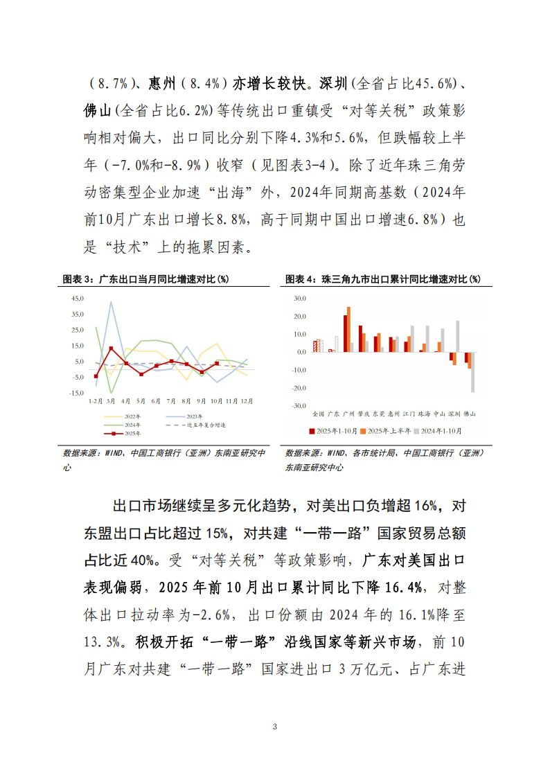 广东出口总量占比仍超20%,出口增速低于全国水平;广州增速领先,佛山、深圳跌幅呈收窄态势。2025年前10月,广东实现出口额4.98万亿元、同比增长1.7%(全国增速:6.2%),占全国出口总额的比重为22.5%,较2024年同期下降0.9个百分点。珠三角九市中,广州表现突出,前10月累计同比增长20.5%,占全省出口比重为13.7%,拉动广东出口增长约2.5个百分点;肇庆(同比增长14.8%,下同)、东莞(8.7%)、惠州(8.4%)亦增长较快。深圳(全省占比45.6%)、佛山(全省占比6.2%)等传统出口重镇受“对等关税”政策影响相对偏大,出口同比分别下降4.3%和5.6%,但跌幅较上半年(-7.0%和-8.9%)收窄(见图表3-4)。除了近年珠三角劳动密集型企业加速“出海”外,2024年同期高基数(2024年前10月广东出口增长8.8%,高于同期中国出口增速6.8%)也是“技术”上的拖累因素。