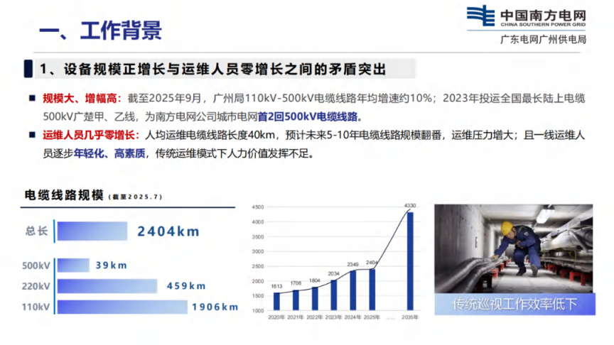 运维人员几乎零增长:人均运维电缆线路长度40km,预计未来5-10年电缆线路规模翻番,运维压力增大;且一线运维人员逐步年轻化、高素质,传统运维模式下人力价值发挥不足。