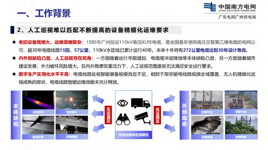 内外部缺陷凸显、人工巡视存在死角:一方面随着运行年限增加,电缆缓冲层烧蚀等本体缺陷凸显;另一方面随着城市建设发展,外力破坏风险增大。在内外隐患双重压力下,人工巡视范围逐渐无法满足安全运行要求。