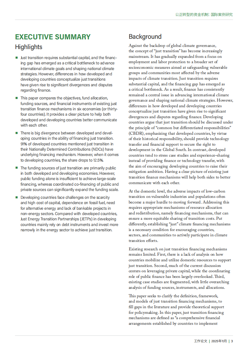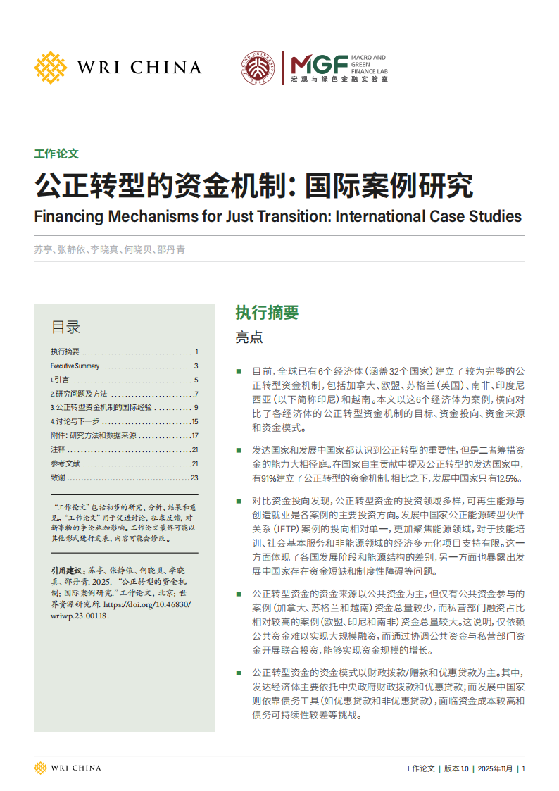 本文重点研究各国为支持公正转型所设计的资金机制。具体研究问题包括: