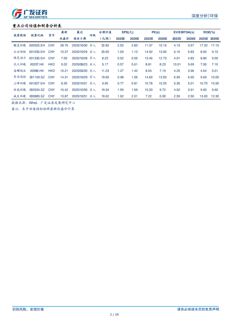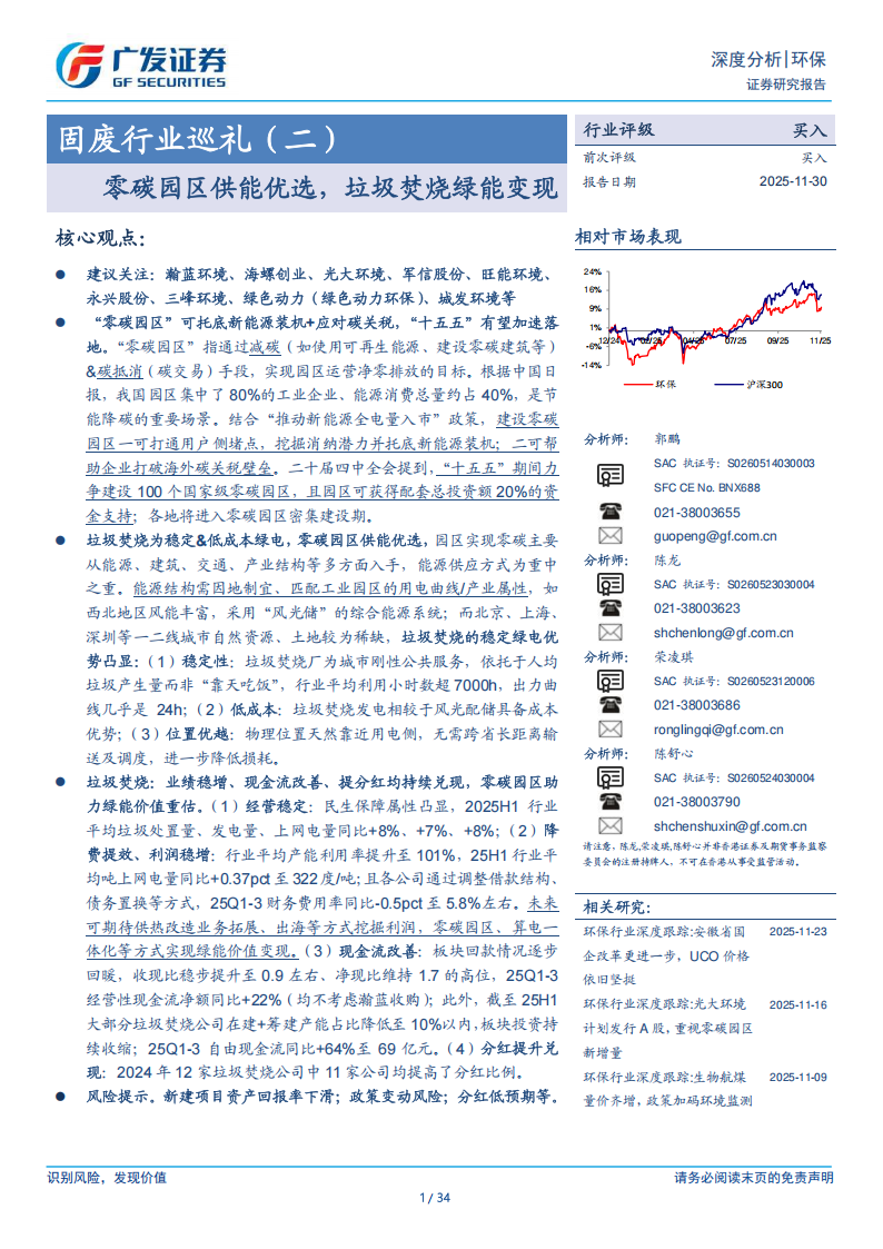 力绿能价值重估。(1)经营稳定:民生保障属性凸显,2025H1行业平均垃圾处置量、发电量、上网电量同比+8%、+7%、+8%;(2)降费提效、利润稳增:行业平均产能利用率提升至101%,25H1行业平均吨上网电量同比+0.37pct至322度/吨;且各公司通过调整借款结构、债务置换等方式,25Q1-3财务费用率同比-0.5pct至5.8%左右。未来可期待供热改造业务拓展、出海等方式挖掘利润,零碳园区、算电一体化等方式实现绿能价值变现。(3)现金流改善:板块回款情况逐步回暖,收现比稳步提升至0.9左右、净现比维持1.7的高位,25Q1-3经营性现金流净额同比+22%(均不考虑瀚蓝收购);此外,截至25H1大部分垃圾焚烧公司在建+筹建产能占比降低至10%以内,板块投资持续收缩;25Q1-3自由现金流同比+64%至69亿元。(4)分红提升兑现:2024年12家垃圾焚烧公司中11家公司均提高了分红比例。