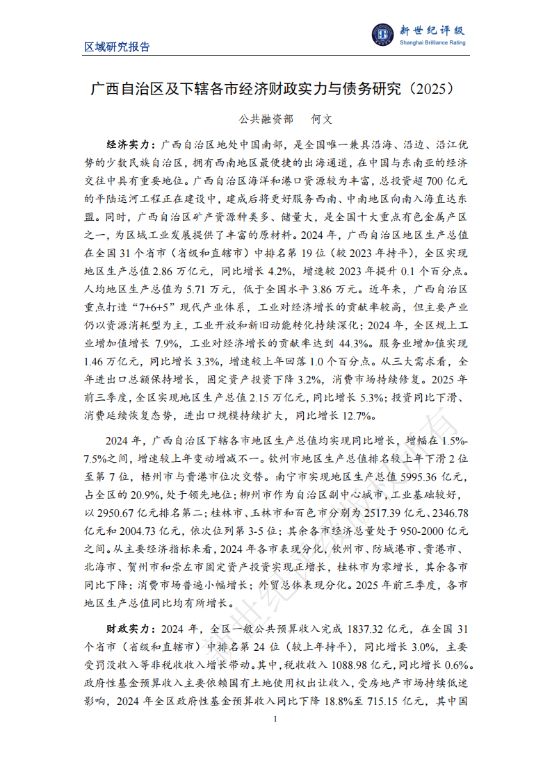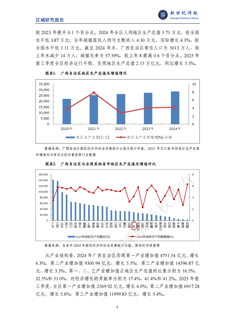 经济实力:广西自治区地处中国南部,是全国唯一兼具沿海、沿边、沿江优势的少数民族自治区,拥有西南地区最便捷的出海通道,在中国与东南亚的经济交往中具有重要地位。广西自治区海洋和港口资源较为丰富,总投资超700亿元的平陆运河工程正在建设中,建成后将更好服务西南、中南地区向南入海直达东盟。同时,广西自治区矿产资源种类多、储量大,是全国十大重点有色金属产区之一,为区域工业发展提供了丰富的原材料。2024年,广西自治区地区生产总值在全国31个省市(省级和直辖市)中排名第19位(较2023年持平),全区实现地区生产总值2.86万亿元,同比增长4.2%,增速较2023年提升0.1个百分点。人均地区生产总值为5.71万元,低于全国水平3.86万元。近年来,广西自治区重点打造“7+6+5”现代产业体系,工业对经济增长的贡献率较高,但主要产业仍以资源消耗型为主,工业开放和新旧动能转化持续深化;2024年,全区规上工业增加值增长7.9%,工业对经济增长的贡献率达到44.3%。服务业增加值实现1.46万亿元,同比增长3.3%,增速较上年回落1.0个百分点。从三大需求看,全年进出口总额保持增长,固定资产投资下降3.2%,消费市场持续修复。2025年前三季度,全区实现地区生产总值2.15万亿元,同比增长5.3%;投资同比下滑、消费延续恢复态势,进出口规模持续扩大,同比增长12.7%。