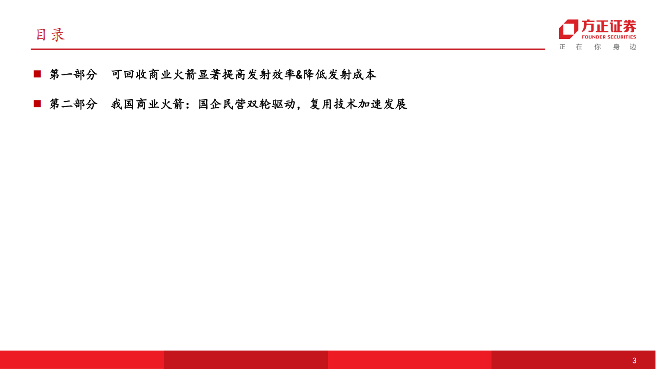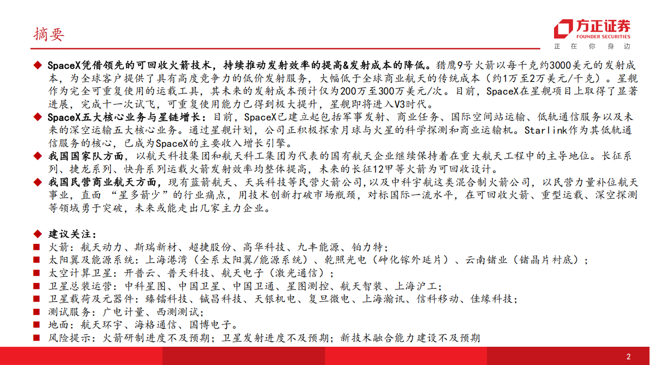 风险提示:火箭研制进度不及预期;卫星发射进度不及预期;新技术融合能力建设不及预期
