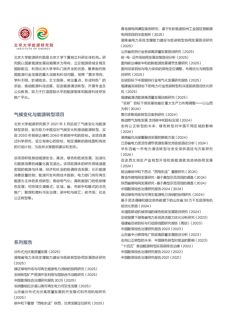 北京大学能源研究院于2021年3月启动了气候变化与能源转型项目,旨在助力中国应对气候变化和推动能源转型,实现2030年前碳达峰和2060年前碳中和的目标。该项目通过科学研究,设立有雄心的目标,制定清晰的路线图和有效的行动计划,为政府决策提供建议和支持。