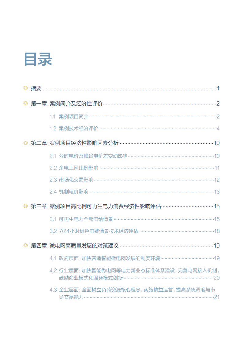 基于上述结论,报告提出三方面建议:在政府层面,应加快营造智能微电网发展的制度环境,将智能微电网作为电力资源主体纳入电力规划,完善调度机制和电力市场体系;同时,地方政府应加强统筹规划,加大试点示范支持力度。在行业层面,加快智能微电网等电力新业态标准体系建设,完善电网接入机制,鼓励商业模式和服务模式创新。在企业层面,应重视负荷资源的价值,实施精益运营,提高系统调度与市场交易能力。