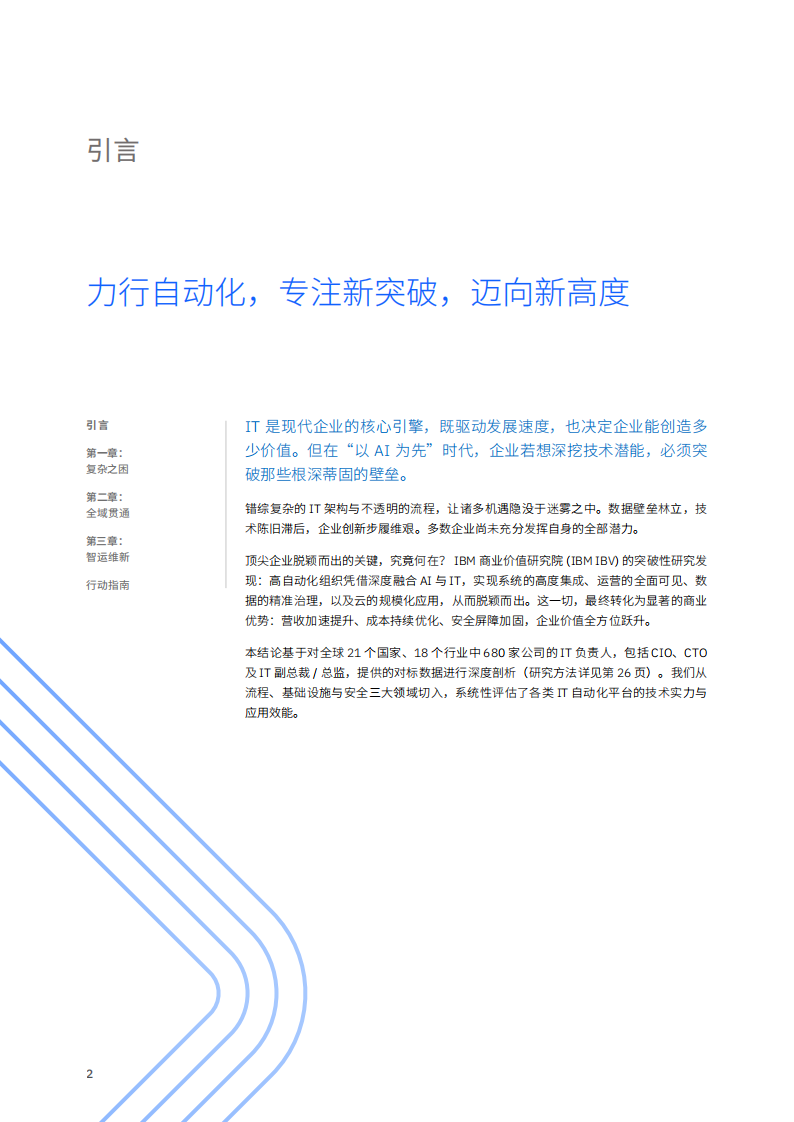 本结论基于对全球21个国家、18个行业中680家公司的IT负责人,包括CIO、CTO及IT副总裁/总监,提供的对标数据进行深度剖析(研究方法详见第26页)。我们从流程、基础设施与安全三大领域切入,系统性评估了各类IT自动化平台的技术实力与应用效能。调研显示,高自动仍 织结借徽字似转型,感咖实理营收10%的可30增长。批外,这些3织实理 感本下降28%。新产品与服务上市周期作显16%,网络安金事件发生率G2减:36%(详纵第10页《磁据旗:智 自动似的商业新移元》)。