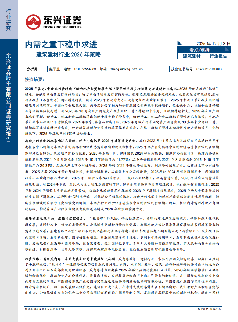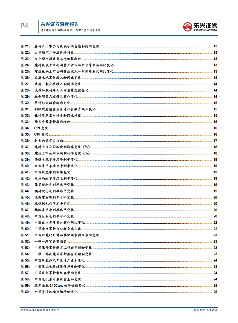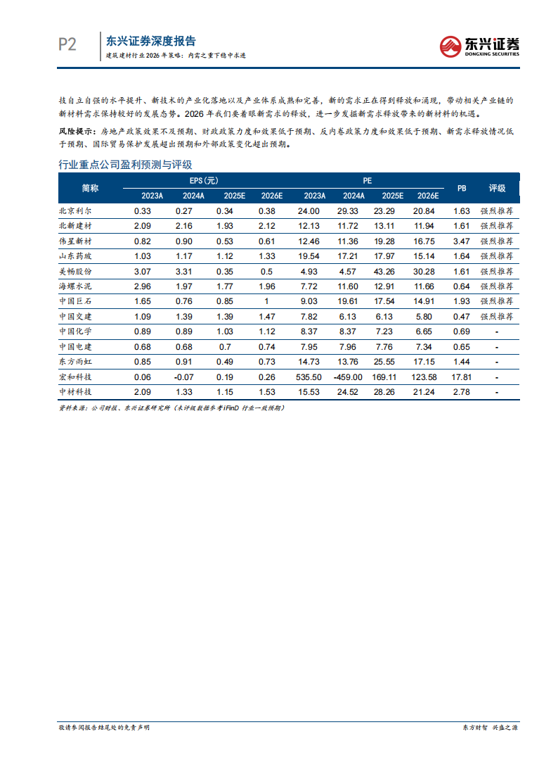投资策略:着眼反内卷、海外发展和新需求受益较大公司。反内卷政策下建材行业上市公司盈利底部有改善,细分行业盈利水平底部波动,“反内卷”加速供给优化带动行业改善持续。水泥、减水剂、塑管、玻璃、涂料和玻纤等细分行业中的龙头公司盈利水平已经在底部出现同比的改善。反内卷作为中央在2025年再次强调的重要行业政策,2026年将继续推动行业供给瑞的加速优化,推动行业产品价格稳定、恢复和上涨。发现提质升级和“走出去”带来的新机遇。在中国经济从粗放式走向高质量发展的阶段,中国相关传统产业的国际化发展也是获得协同发展优势的重要路径。中国传统产业国际竞争优势明显,海外需求空间广,和中国发展协同效应大。建筑企业走出去,在海外发展的态势也在不断地向好。我们看好产品和服务能够走出去、企业能够走出去的优秀上市公司在国际新赛道的广阔发展新空间。发掘新需求释放带来的新材料机会,随着中国科挂自立自强的水平提升、新技术的产业化落地以及产业体系成熟和完善,新的需求正在得到释放和涌现,带动相关产业链的新材料需求保持较好的发展态势。2026我们要着眼新需求的释放,进一步发掘新需求释放带来的新材料的机遇。风险提示:房地产政策效果不及预期、财政政策力度和效果低于预期、反内卷政策力度和效果低于预期、新需求释放情况低风险提示:房地产政策效果不及预期、财政政策力度和效果低于预期、反内卷政策力度和效果低于预期、新需求释放情况低于预期、国际贸易保护发展超出预期和外部政策变化超出预期。于预期、国际贸易保护发展超出预期和外部政策变化超出预期。