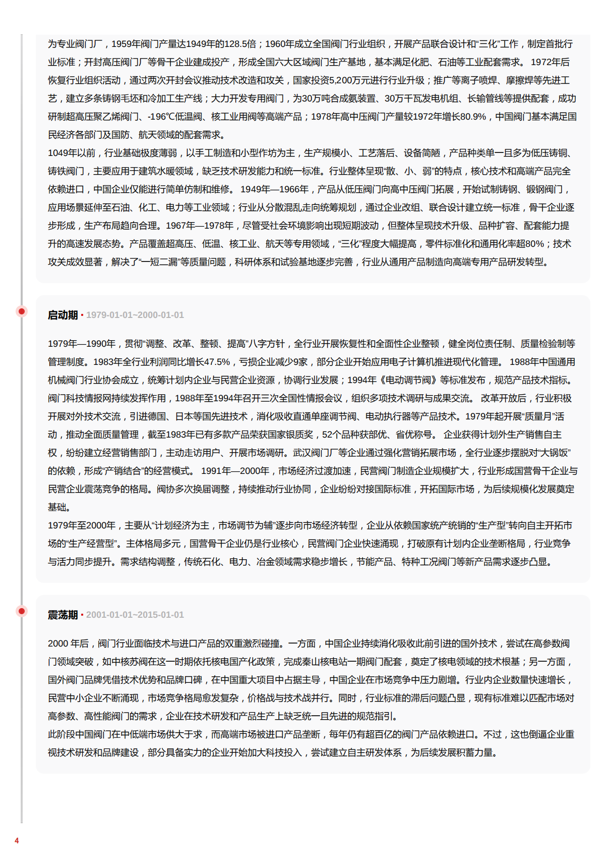 1049年以前,行业基础极度薄弱,以手工制造和小型作坊为主,生产规模小、工艺落后、设备简陋,产品种类单一且多为低压铸铜。铸铁阀门,主要应用于建筑水暖领域,缺乏技术研发能力和统一标准。行业整体呈现散。小弱的特点,核心技术和亮端产品完全依赖进口,中国企业仅能进行简单仿制师和维修。1949年—1966年,产品从低压阀门向高中压阀门拓展,开始试制铸钢、锻钢阀门,应用场景延伸至石油、化工、电力等工业领域;行业从分散混乱走向统筹规划,通过企业改组、联合设计建立统一标准,骨干企业逐步形成,生产布局趋向合理。1967年—1978年,尽管受社会环境影响出现短期波动,但整体呈现技术升级、品种扩容、配套能力提升的高速发展态势。产品覆盖超亮压、低温、核工业、航天等专用领域,“三化程度大幅提高,零件标准化和通用化率超80%;技术攻关成效显著,解决了“一短二漏“等质量问题,科研体系和试验基地逐步完善,行业从通用产品制造向亮端专用产品研发转型。