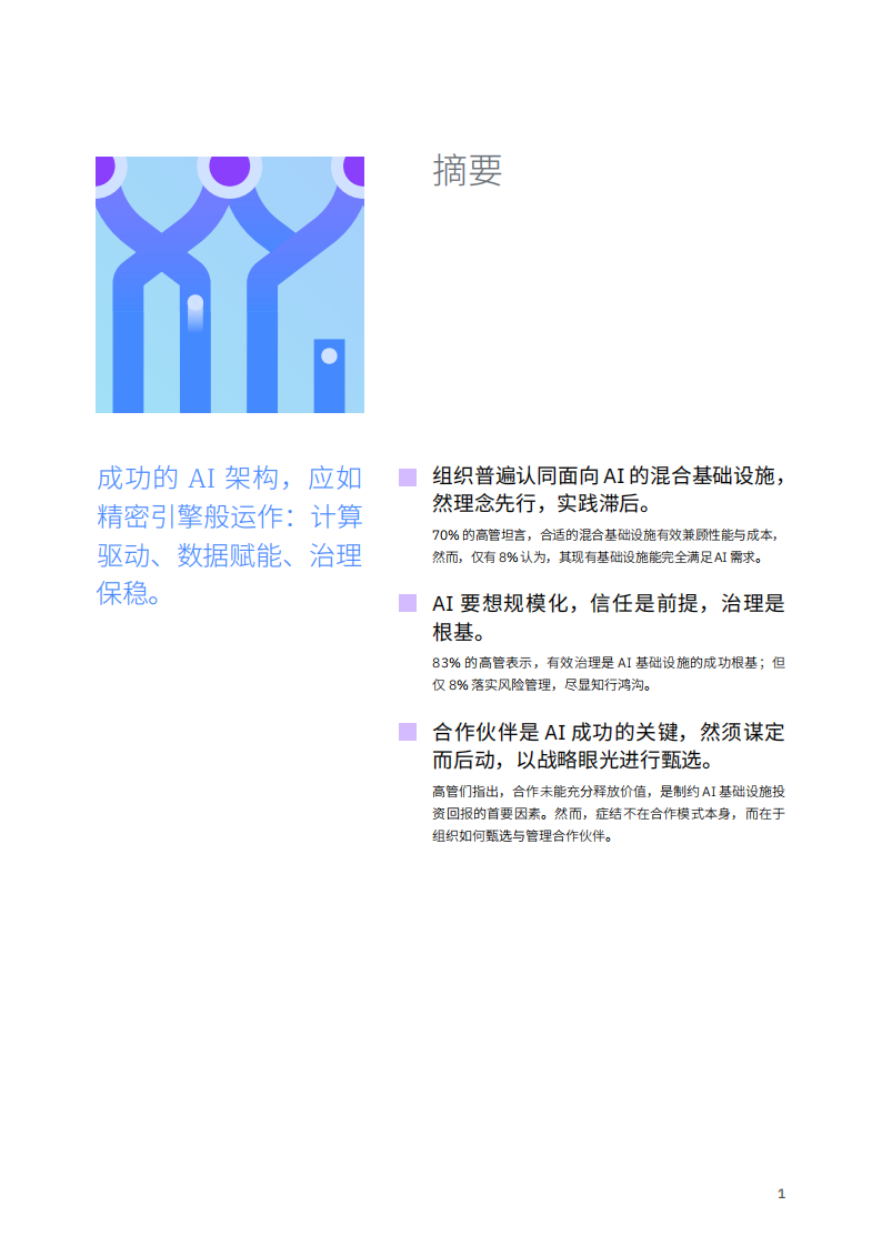 分析表明,具备高成熟度与基础设施就绪度的组织,共享一套共通基因,助其实现价值驱动的AI应用。(详见第17页观点:“AI落地的必备要素”)。这些核心能力,正是打造“有设计、有集成、有成效”的AI基础设施蓝图。即便组织战略方向明晰,但AI落地仍受制于基础设施短板。62%的高管立志三年内实现跨环境AI部署,但仅有8%的高管认为,现有基础设施能完全满足AI需求。这一巨大落差,实为战略天花板,而非单纯技术鸿沟。