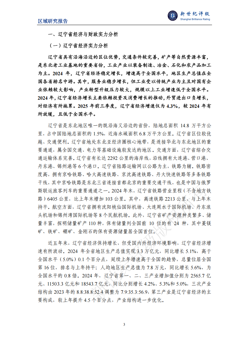 稳步增长;规模以上工业增加值同比增长3.1%,低于全国2.7个百分点;规模以上工业企业营业收入和利润总额同比双降。2024年,辽宁省经济增长主要依赖投资及消费增长的推动,外贸进出口负增长对经济有所拖累。2025年前三季度,辽宁省实现地区生产总值2.4万亿元,按不变价格计算,同比增长4.3%,低于全国0.9个百分点。辽宁省传统工业占比较大,对国有企业较为依赖,民营经济发展不充分,一定程度上制约了地区经济发展的活跃性,产业转型压力较大。